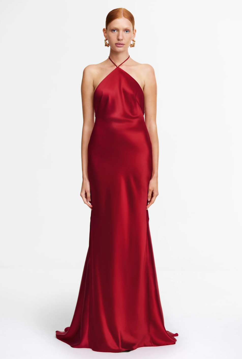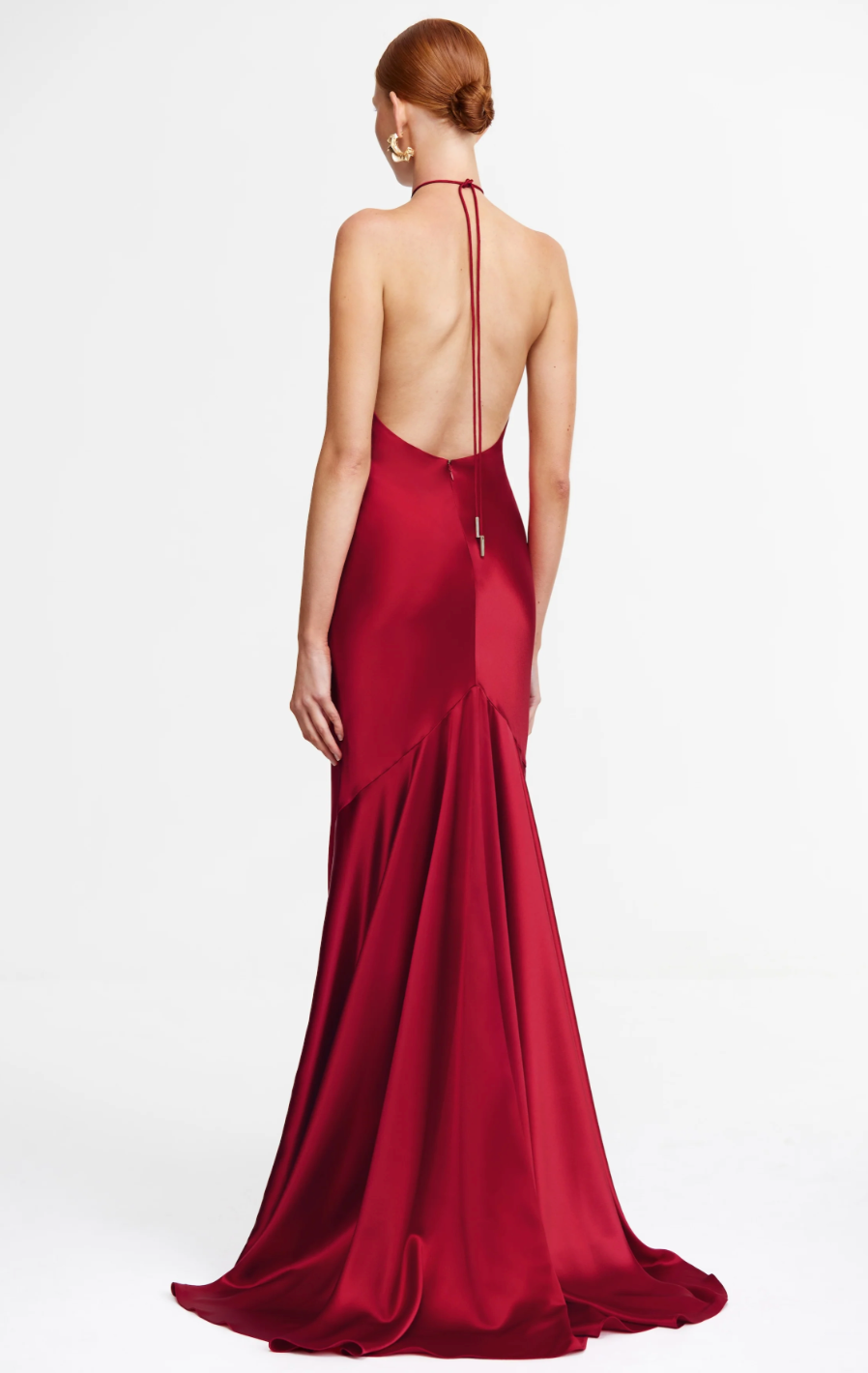 The Tarnacre Gown in Crimson embodies elegant refinement. Made from glossy satin, its bias-cut design cascades gracefully, accentuating fluid movement. Featuring a halter neckline with subtle rouleau ties that lead to a captivating open back, the mermaid shape transitions into a sweeping train. Perfect for formal events, this gown captures enduring glamour with effortless style.