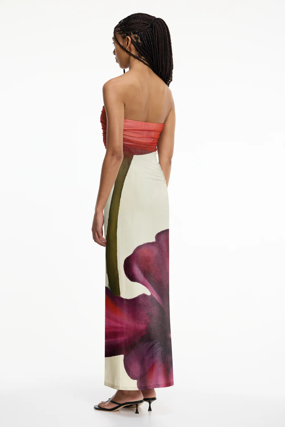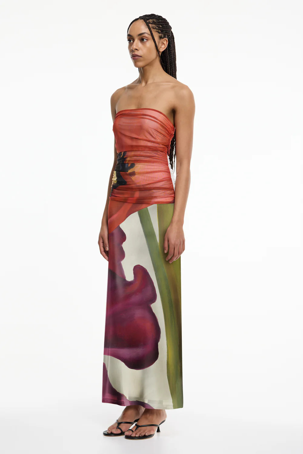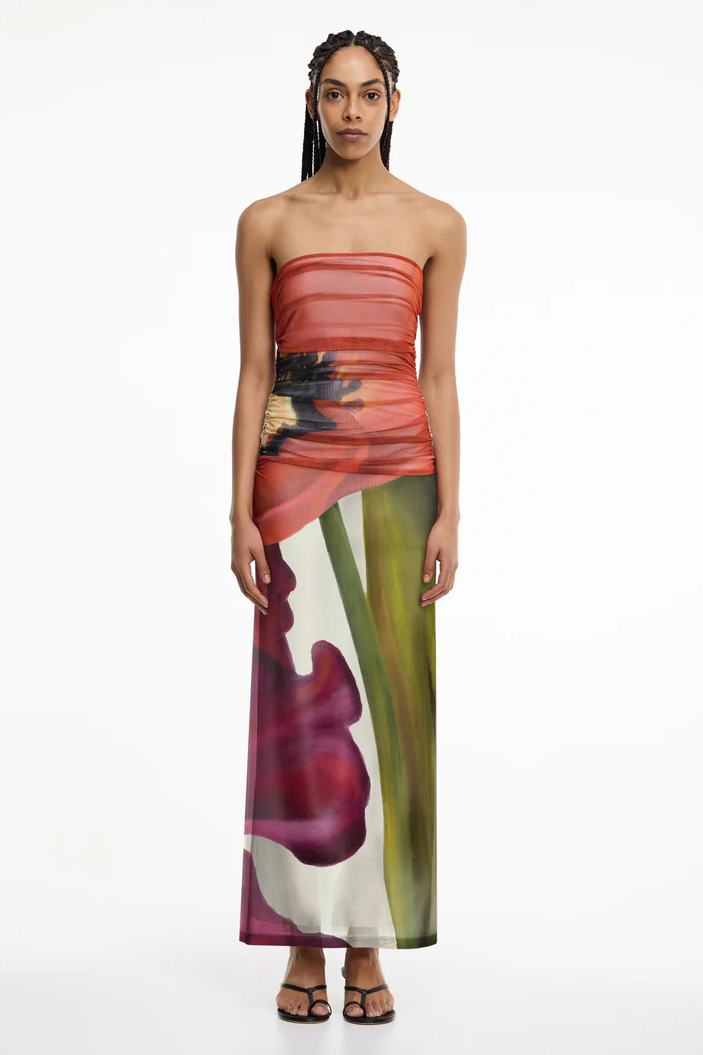 The Sura Strapless Dress in Poppy Botanic offers a refined silhouette for occasion dressing, defined by a strapless maxi shape and exclusive floral print in red, green, and purple hues. Crafted from a lightweight mesh fabrication, its ruched bodice and gathered side seams lend sculptural interest, ideal for elevated summer styling.
