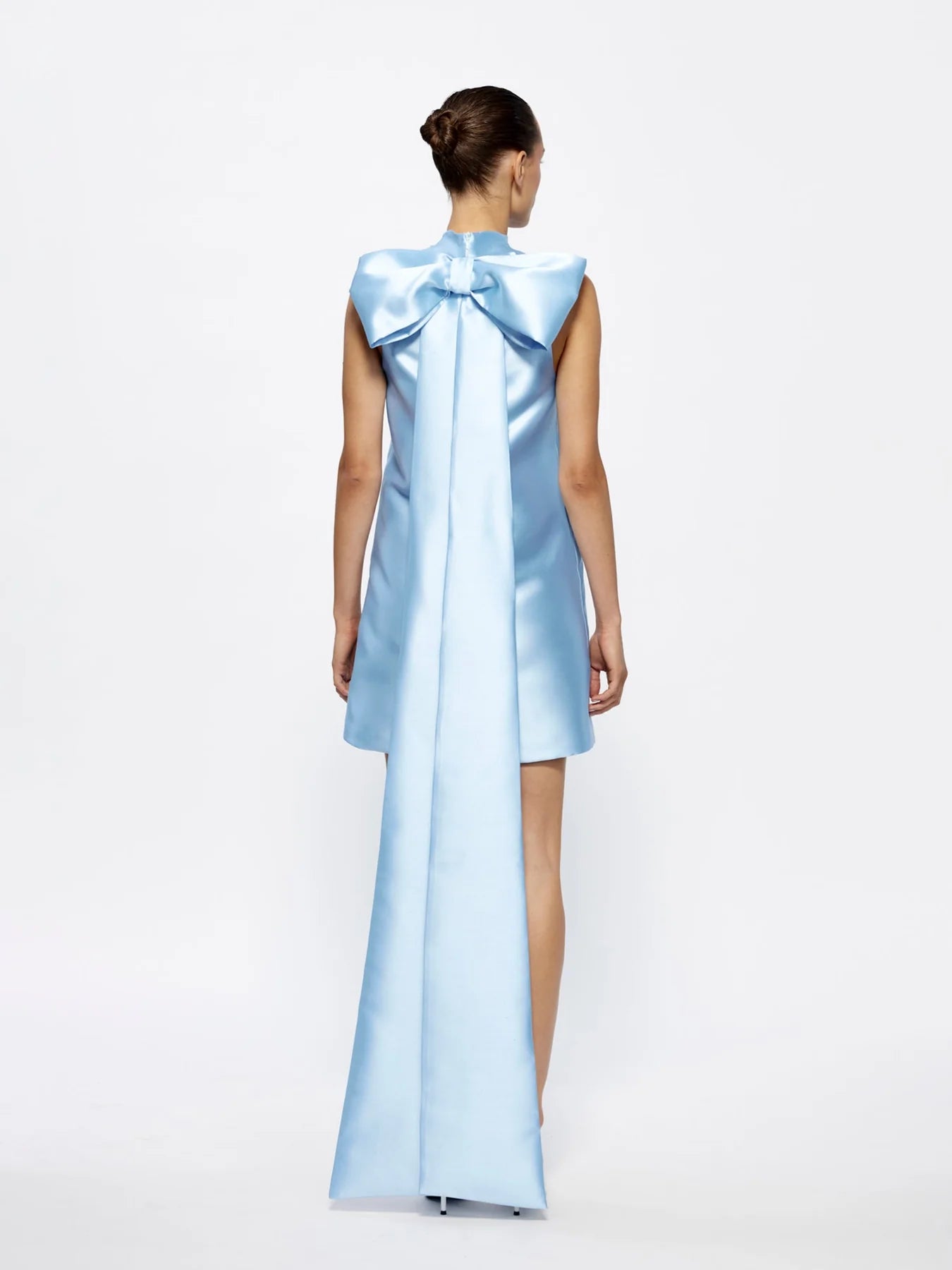 Welcoming the Jorja Mini, an ode to effortless elegance. Our fun and playful take on a mini dress, crafted in a luxurious heavyweight satin for beautiful feel on the body. Detailed with a statement bow at the neckline with a floor length train. Jorja features a sleek and minimal silhouette for a simple yet feminine finishing touch. Detachable bow.