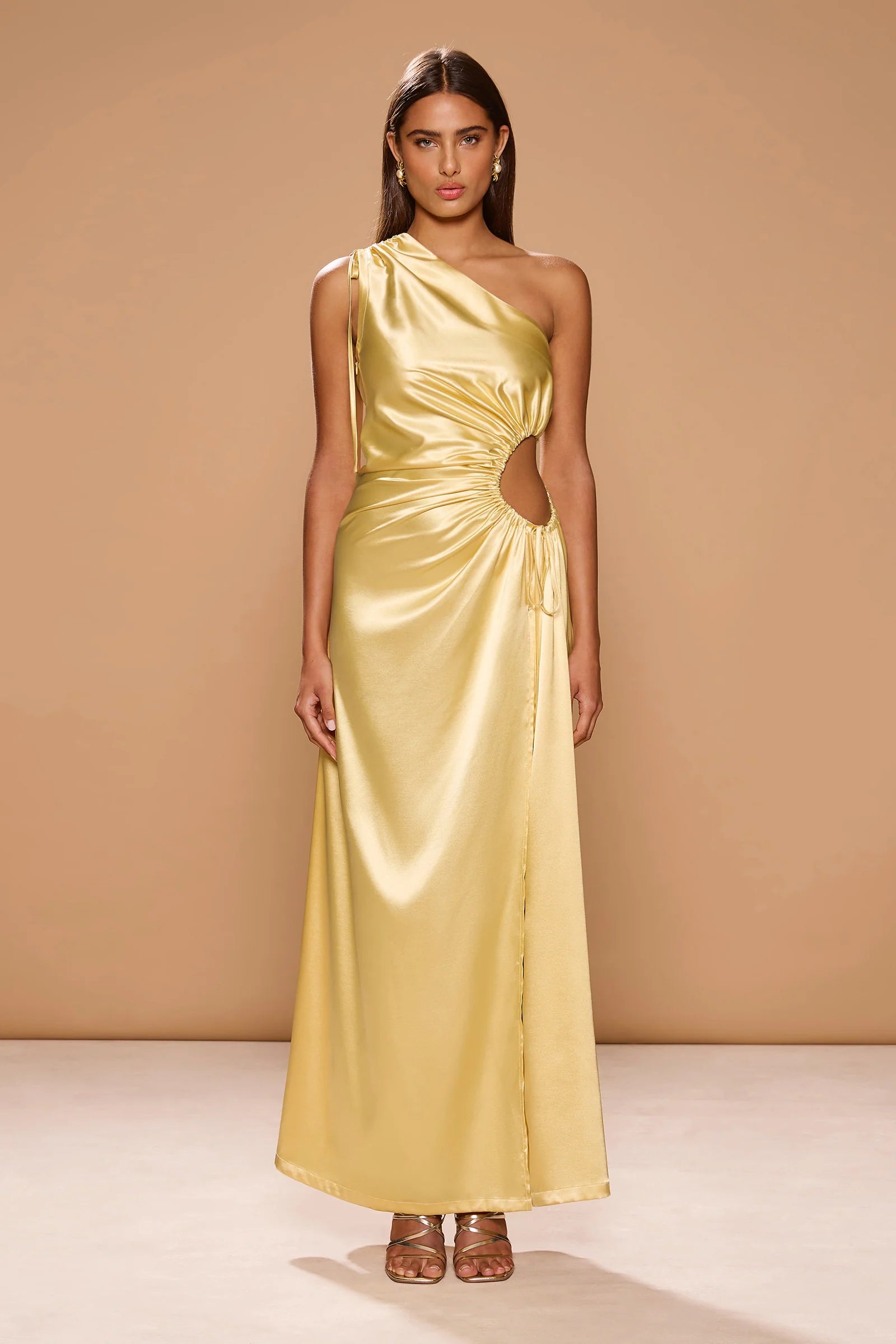 The Nour Dress in Gold presents an architectural one-shoulder design with a refined adjustable tie at the hip and waist. Artfully placed ruching creates a distinctly feminine silhouette, while the elegant high split enhances the dress's sophisticated contours for a graceful, flattering appearance.