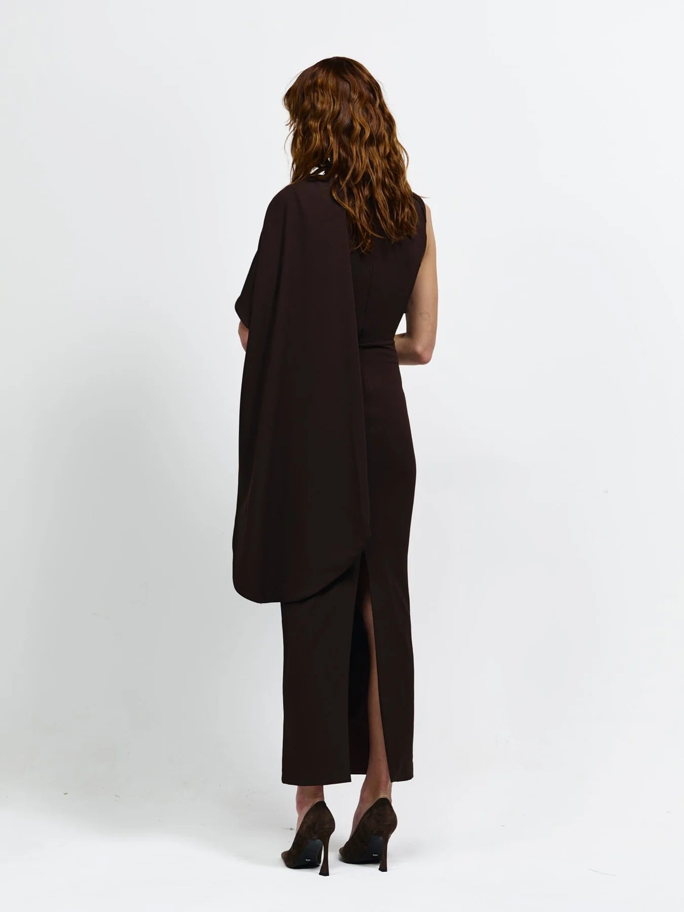 Presenting the Romi Dress, an exquisite blend of detailed craftsmanship and graceful style. This dress showcases an asymmetrical neckline highlighted by flowing sculptural drapes that enhance the silhouette. Made from our distinctive crepe fabric, it contours the body elegantly while offering subtle coverage and understated luxury. The Romi Dress captures contemporary elegance and makes a polished statement, ideal for the approaching event season.