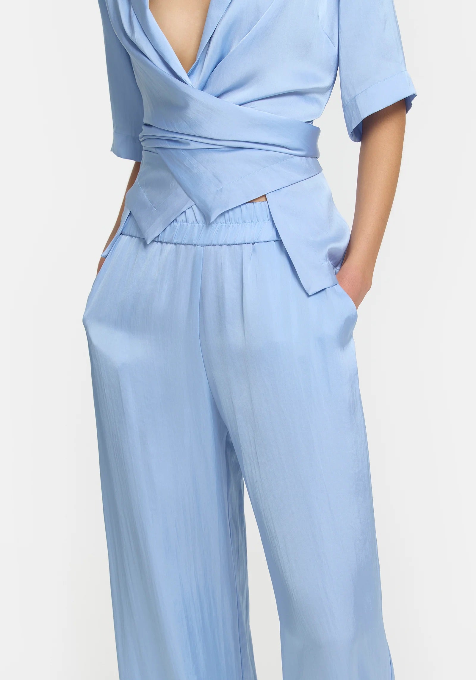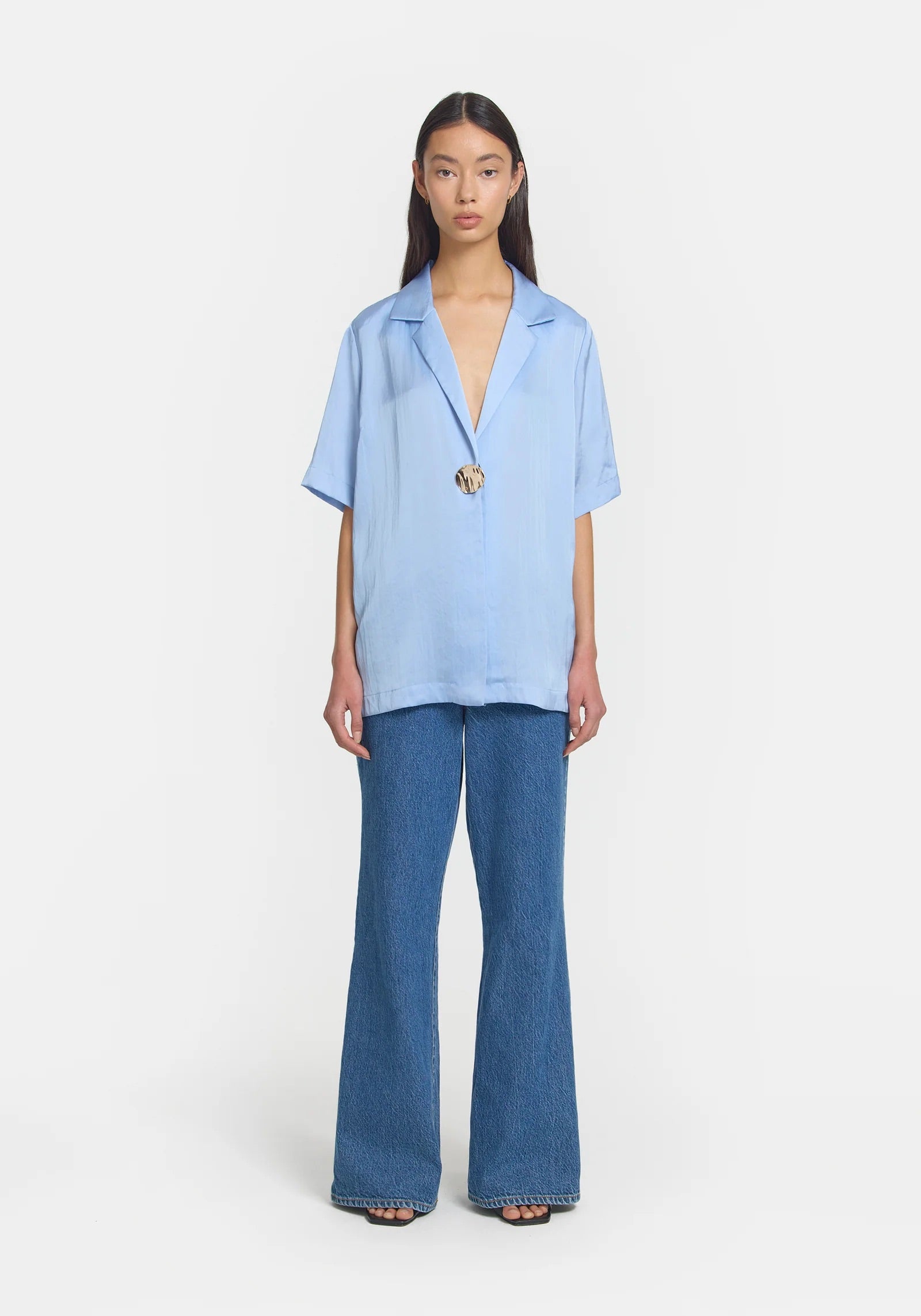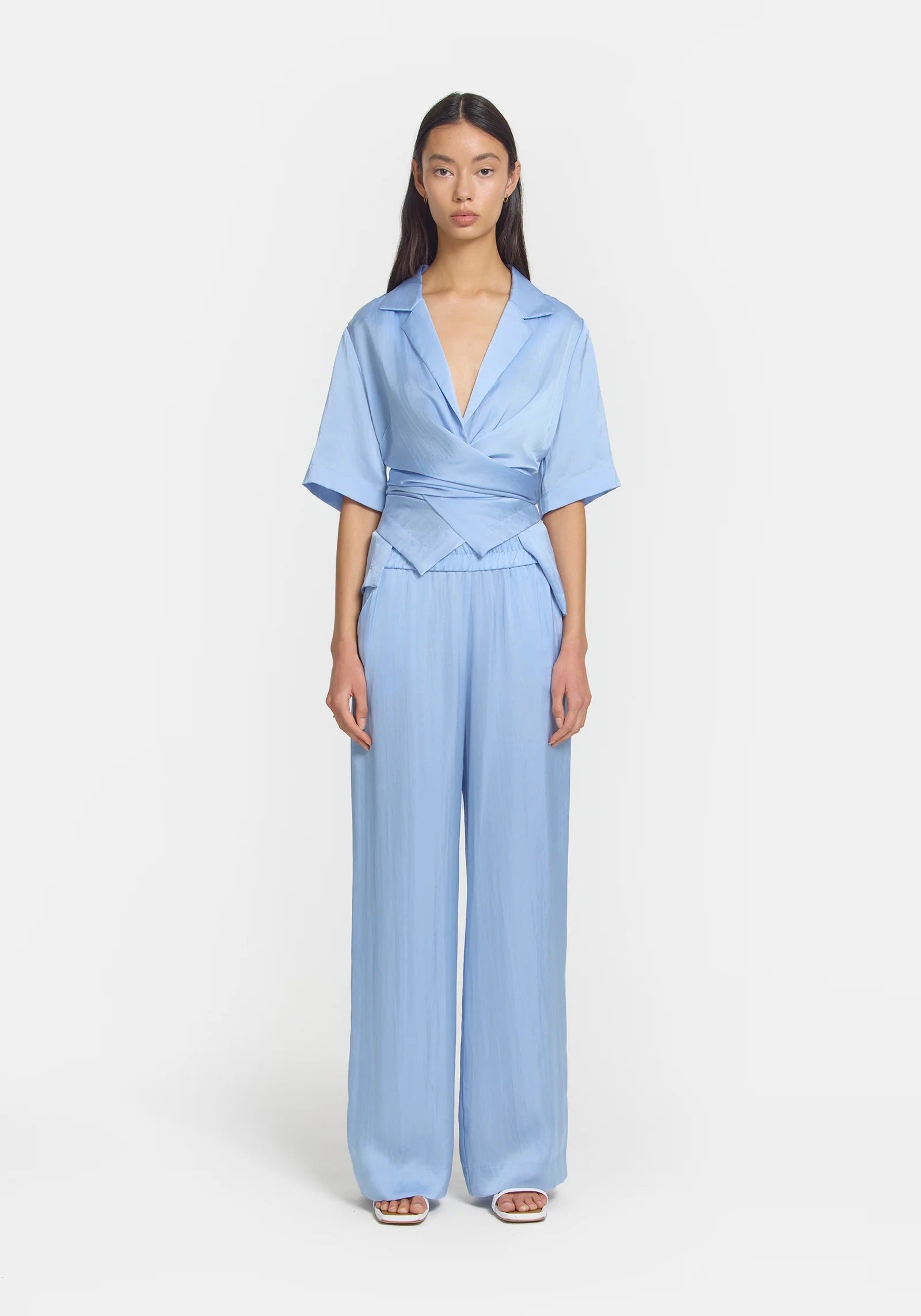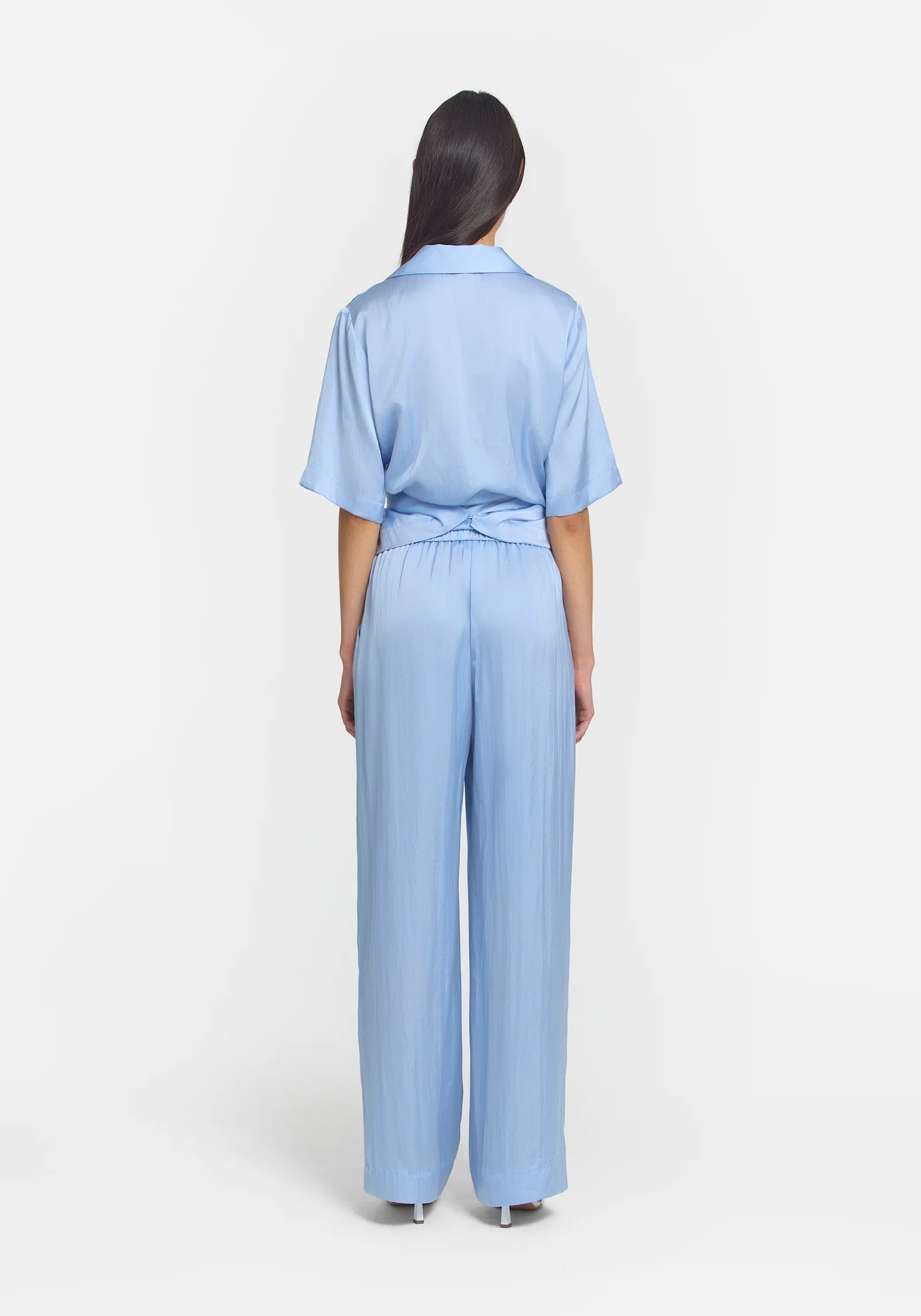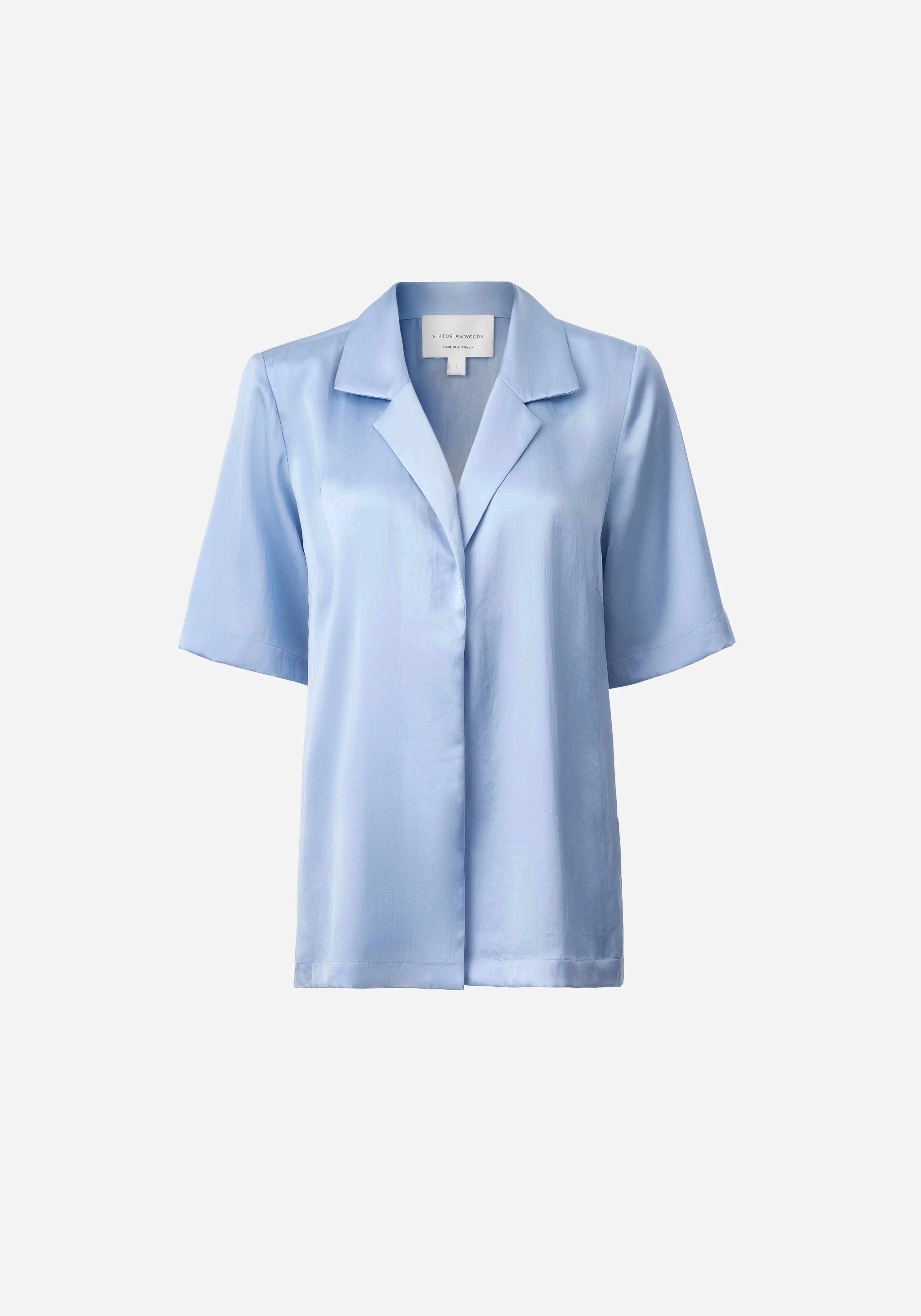 Experience the elegance of the Applause Shirt & Pilot Pant Set, a modern take on Viktoria & Wood's iconic Chorus Shirt and pilot pant. Crafted in luxurious light blue cupro, this sophisticated ensemble includes a detachable gold brooch and unique inner button for versatile styling. Indulge in the subtle luxury of this matching set in a refined hue.