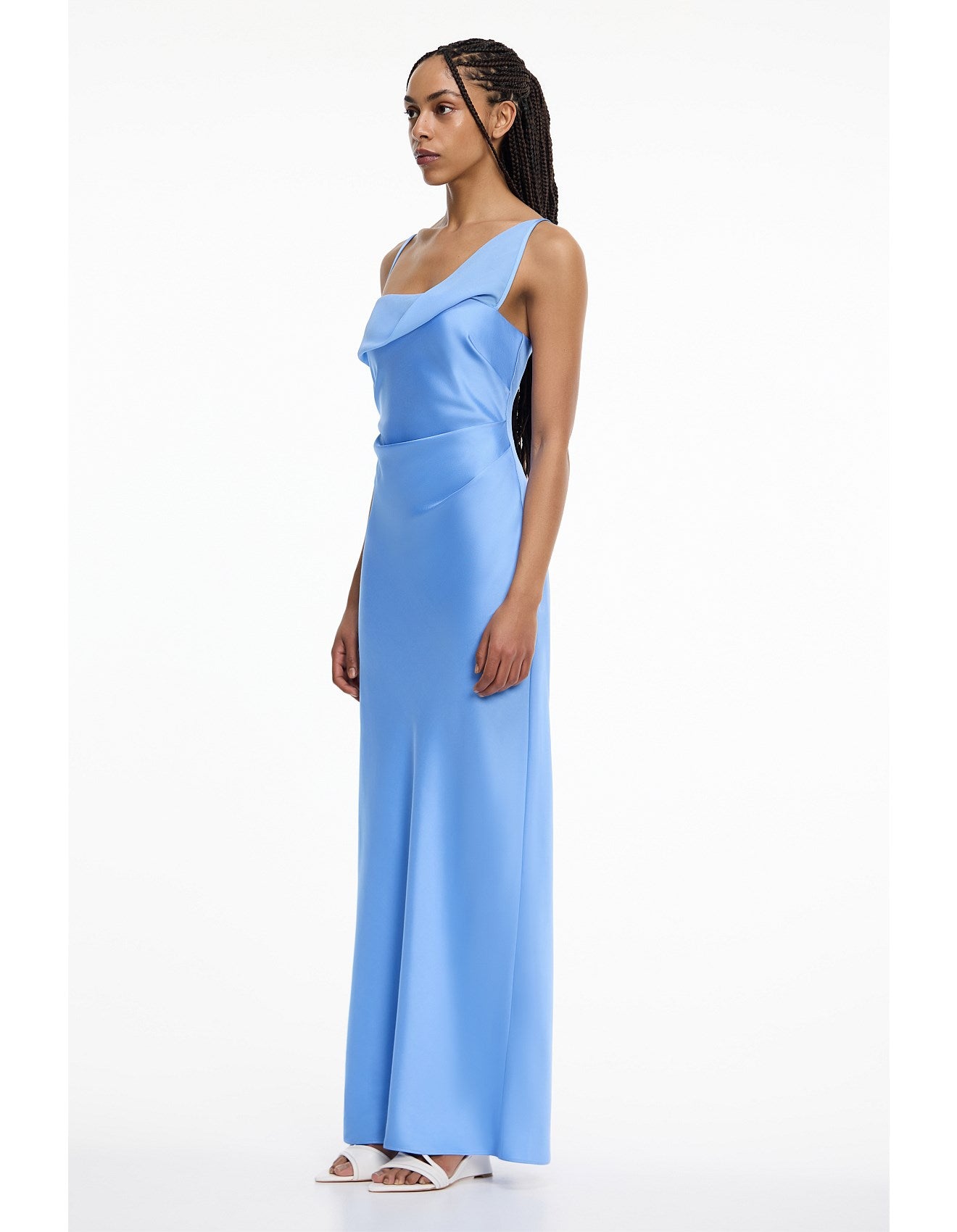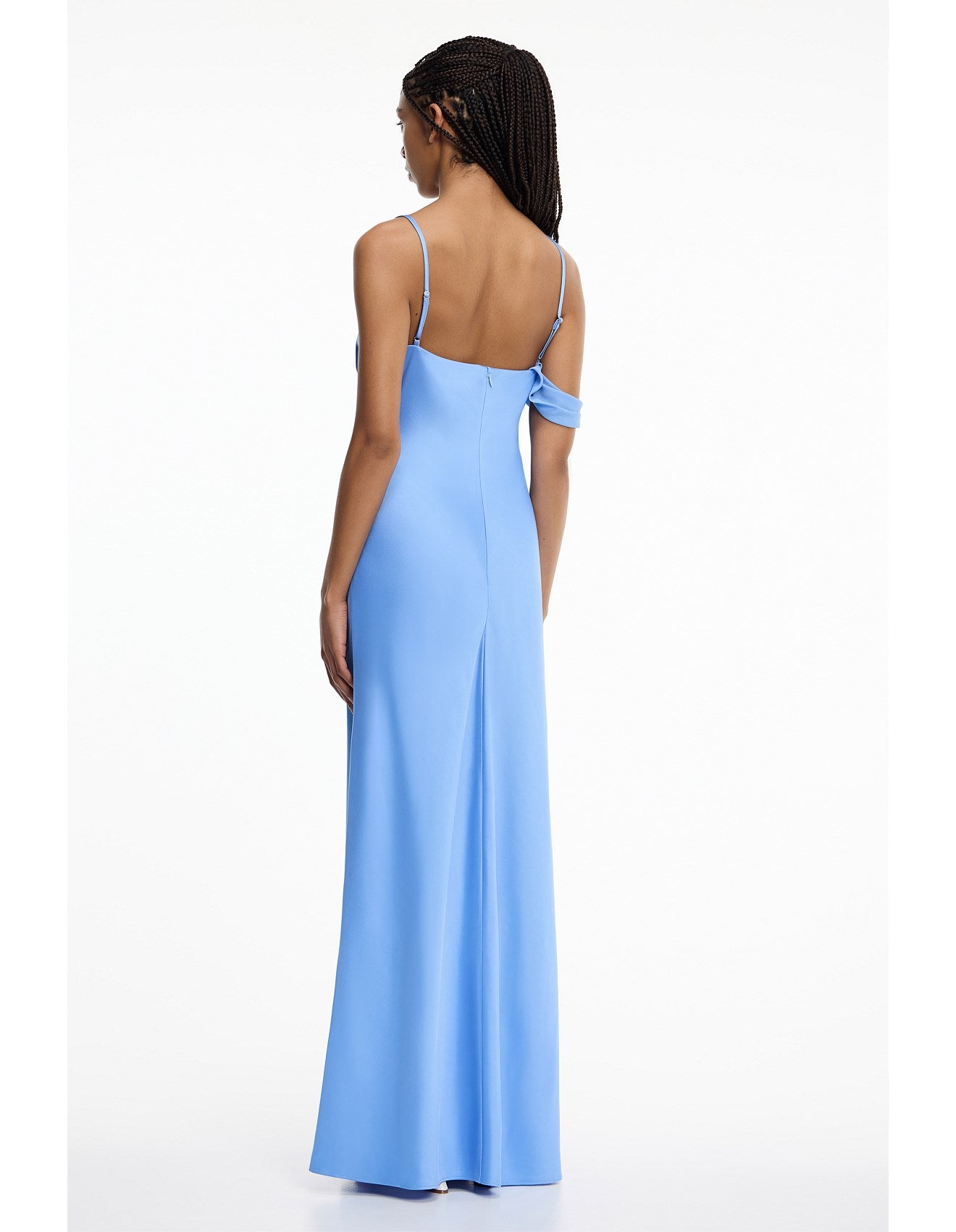 - Maxi dress- Satin fabrication- One-shoulder neckline with adjustable straps- Asymmetrical draping- Contrast sheer drape sleeve and neckline detail- Center back invisible zipper closure- Unlined