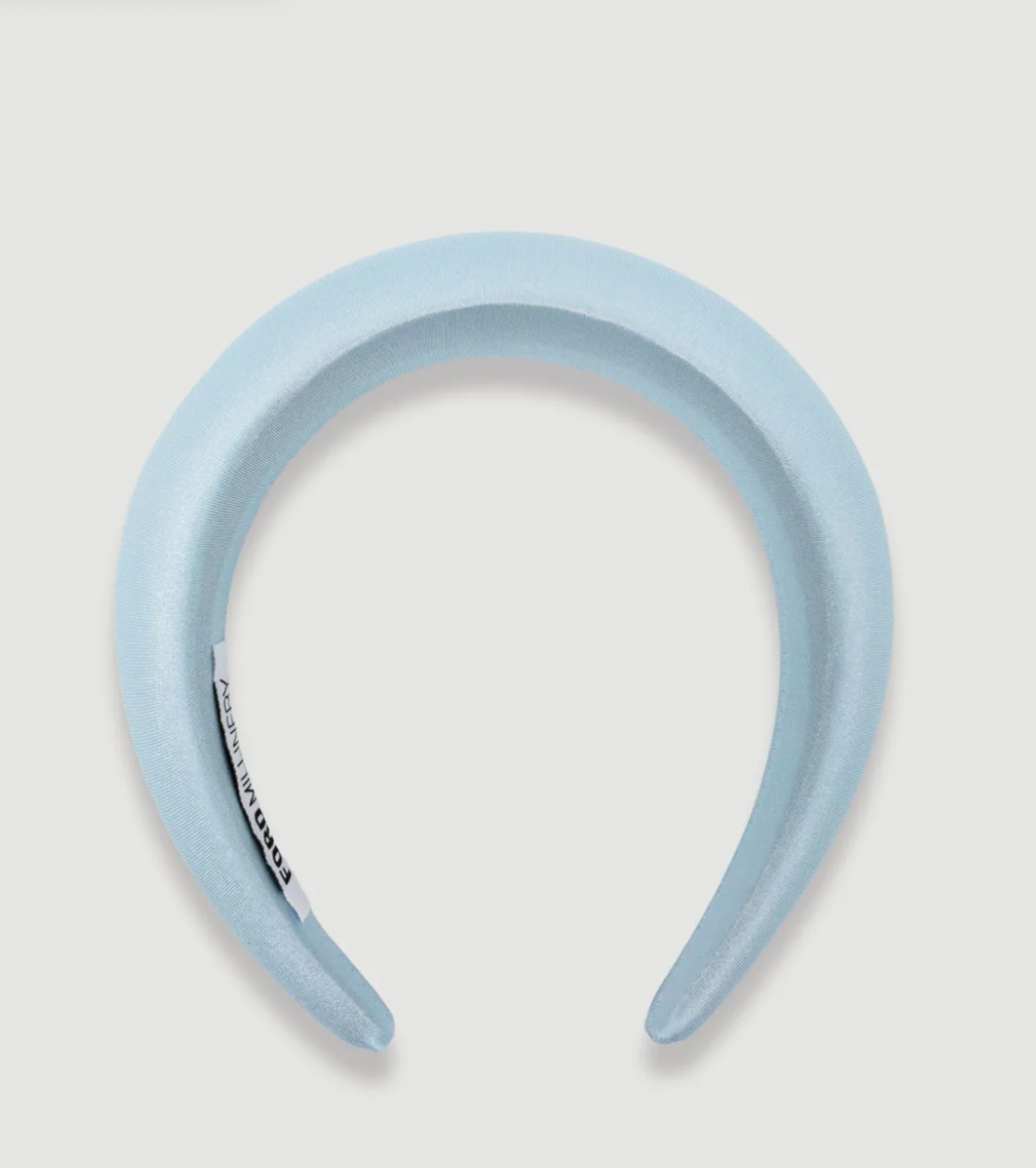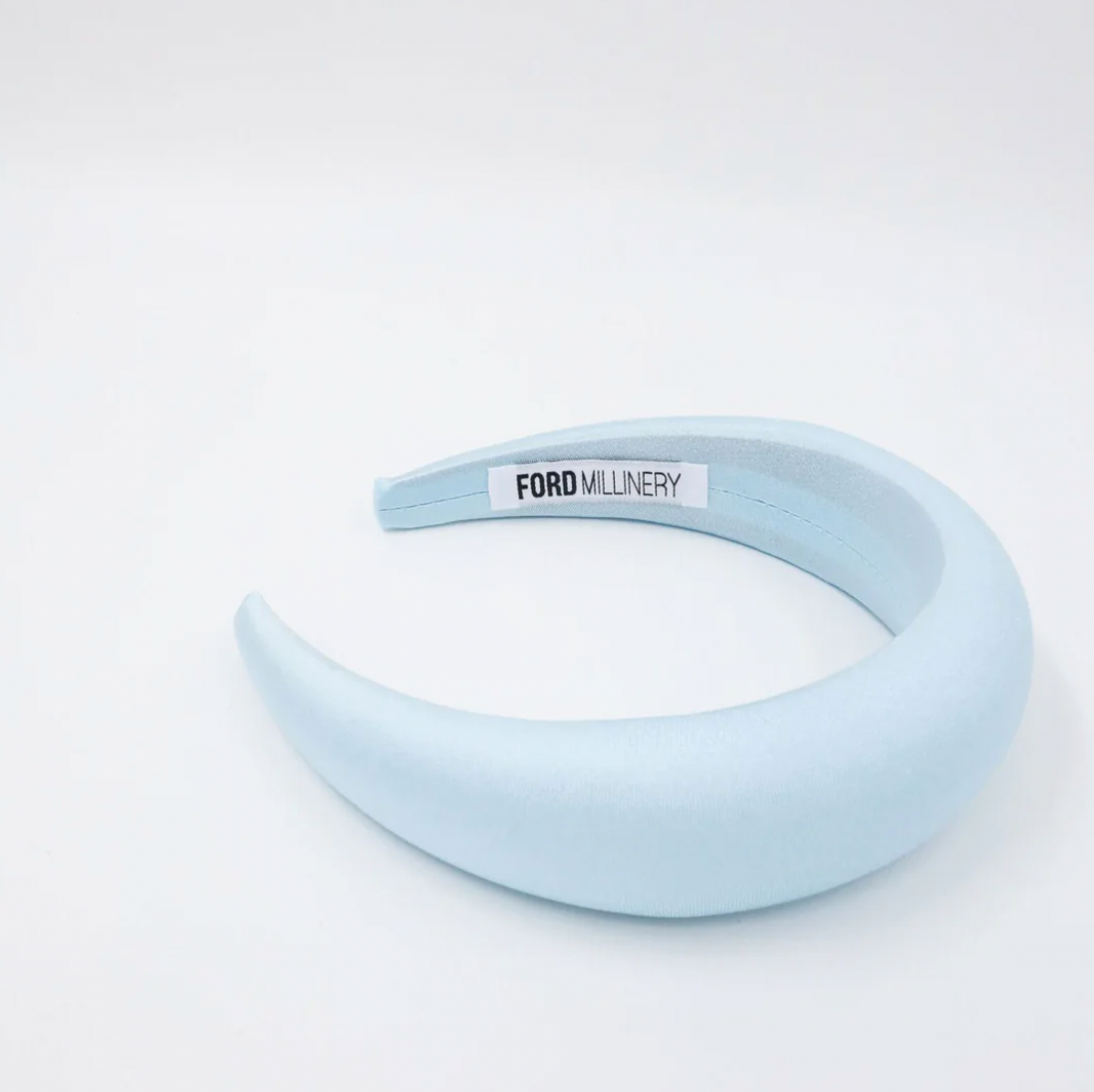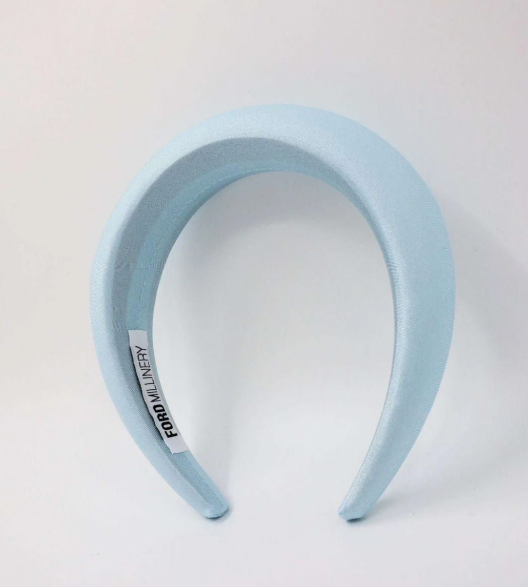 The Monica Headband is a luxurious, padded headband created by Ford Millinery. Featuring a metallic-finish light blue design, the headband adds a touch of elegance to any Spring Racing ensemble.