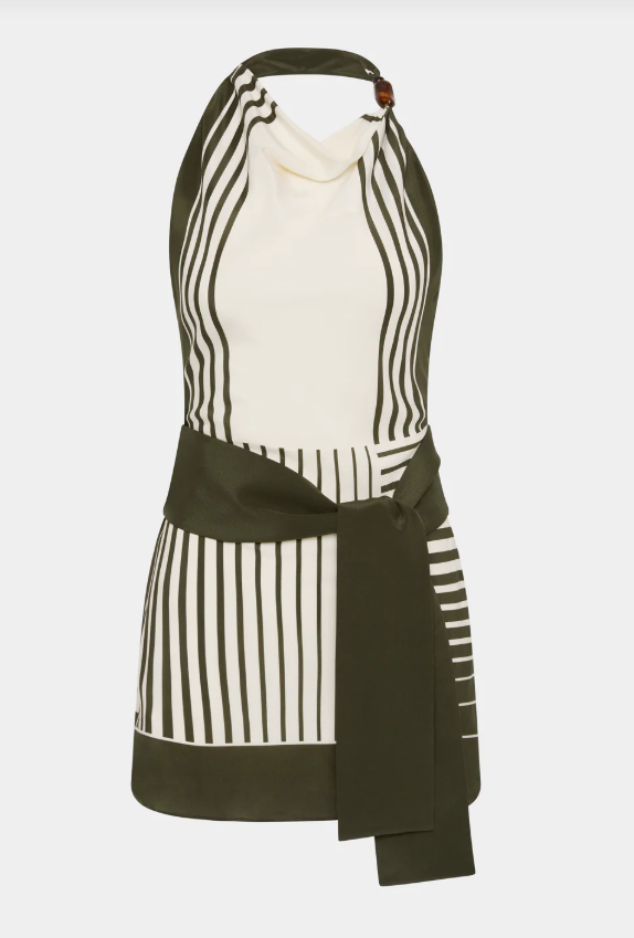 Introducing an effortless piece of refined elegance: this mini dress showcases a sumptuous silk crepe de chine fabric in an exclusive Garden Stripe design. The silhouette flows gracefully with a high cowl neckline embellished with delicate beading, while the open back adds an unexpected touch of allure. A detachable waist tie allows you to customise the fit, making it equally stunning dressed up or down.