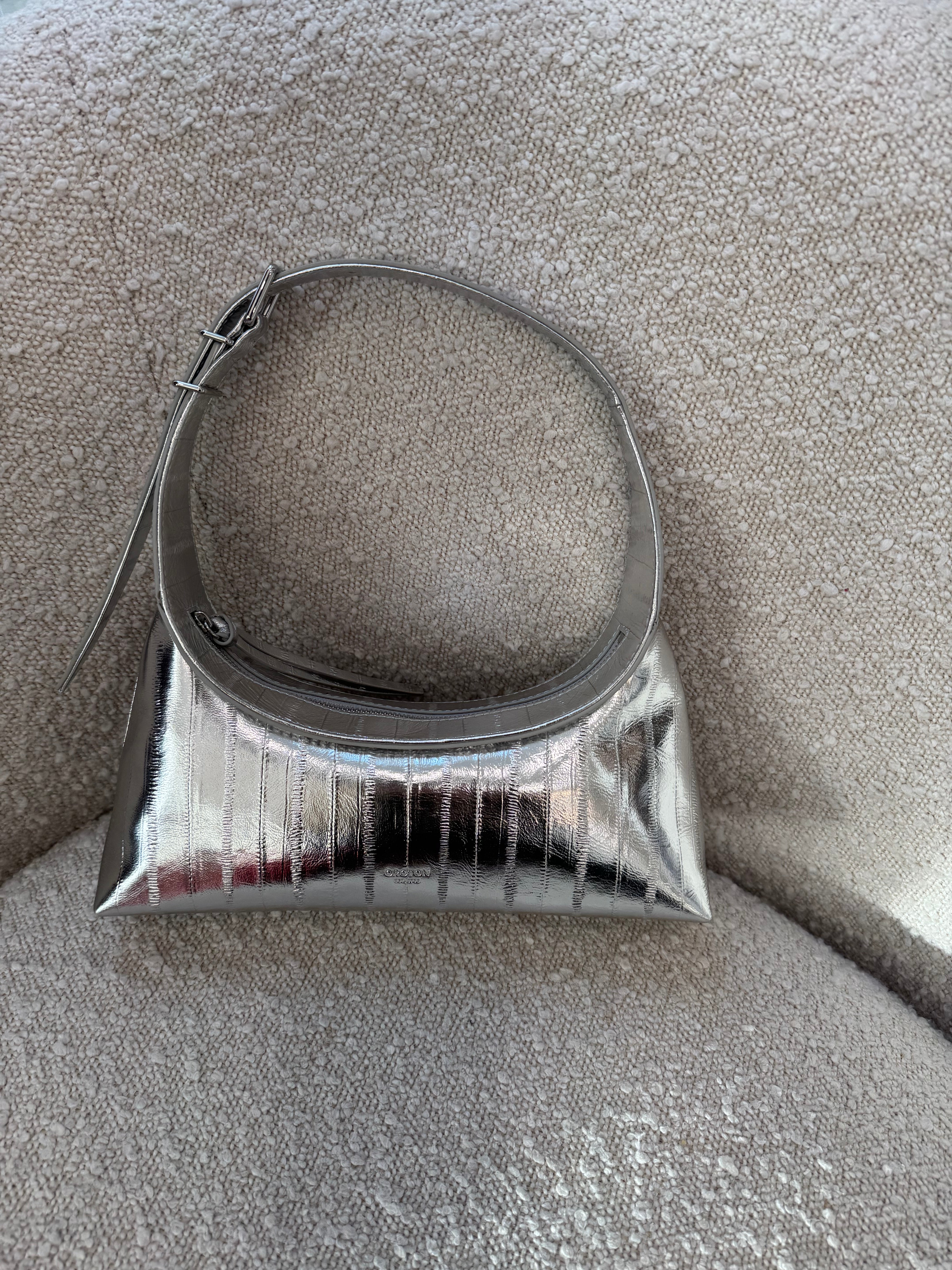Enhance your ensemble with the Cinder Metallic Mini Baguette. Made from metallic embossed leather, this elegant bag offers a top zip closure, a roomy main compartment with a card slot, and adjustable top handles. Ideal for both daytime and evening occasions, it blends contemporary luxury with classic sophistication.