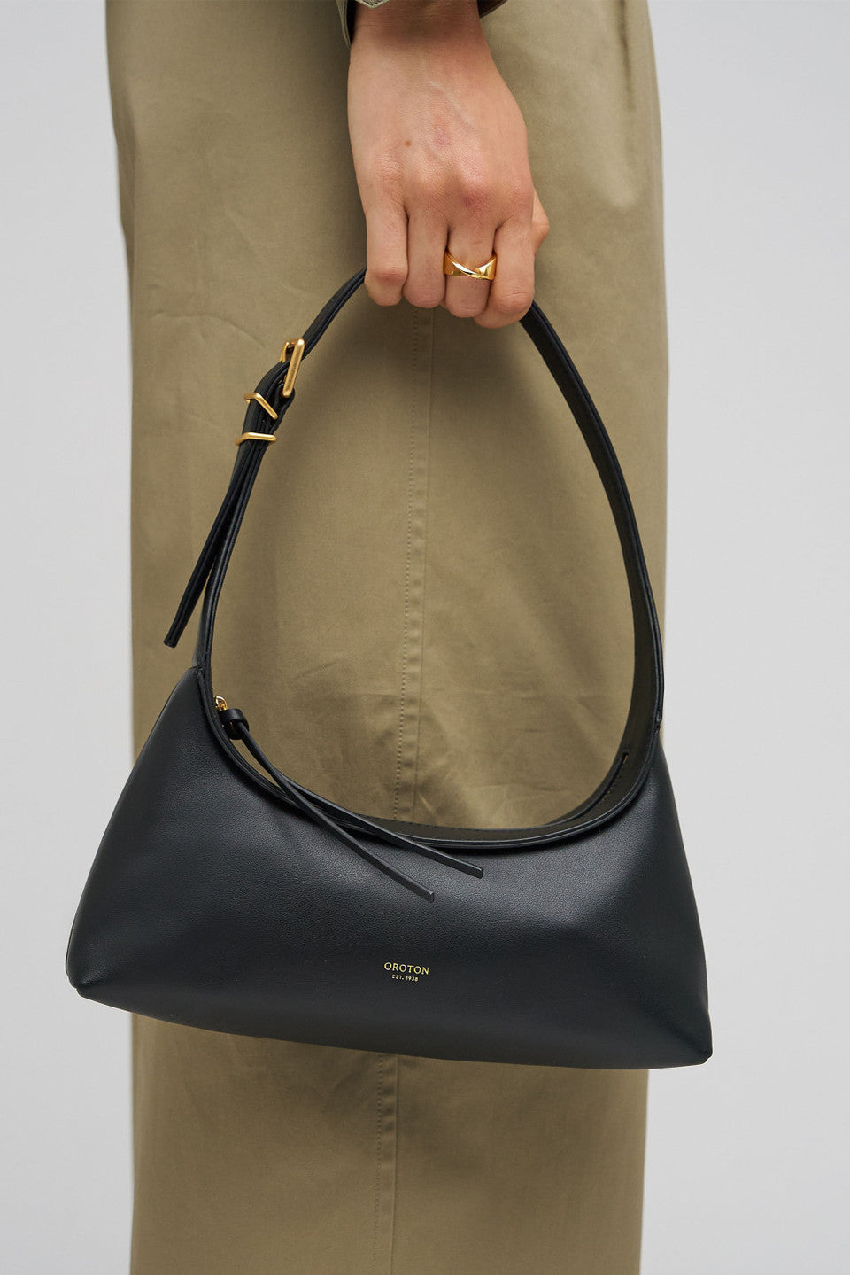 The Cinder Mini Baguette embodies Oroton's signature luxury and timeless design. Crafted from crackle leather, it features a top zip closure, spacious main compartment, and adjustable top handles. This versatile piece is perfect for both everyday use and special occasions.