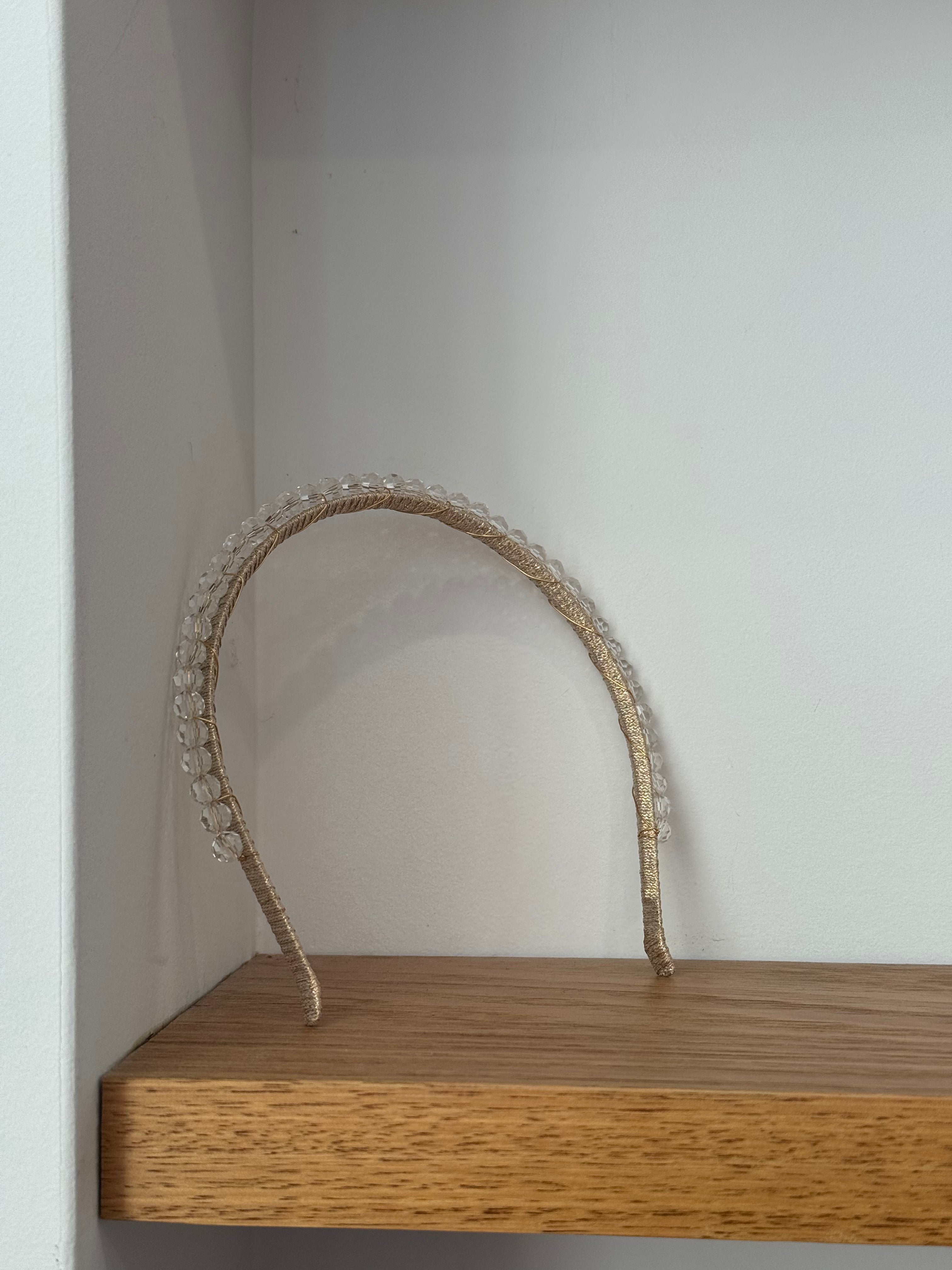 Elevate your look with this exquisite gold headband adorned with shimmering crystal beads. Its refined design adds a touch of elegance and sophistication to any hairstyle, making it perfect for special occasions or refined daily wear. Lightweight yet striking, this headband effortlessly enhances your ensemble with a subtle sparkle.