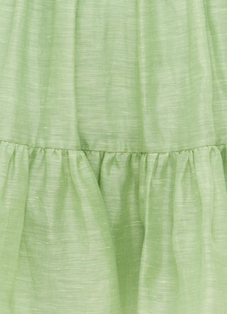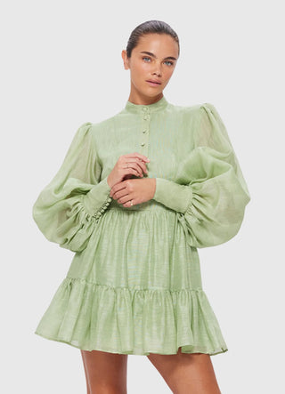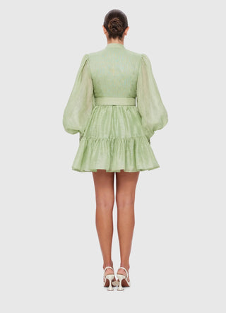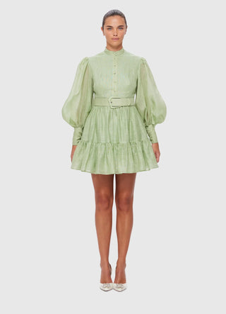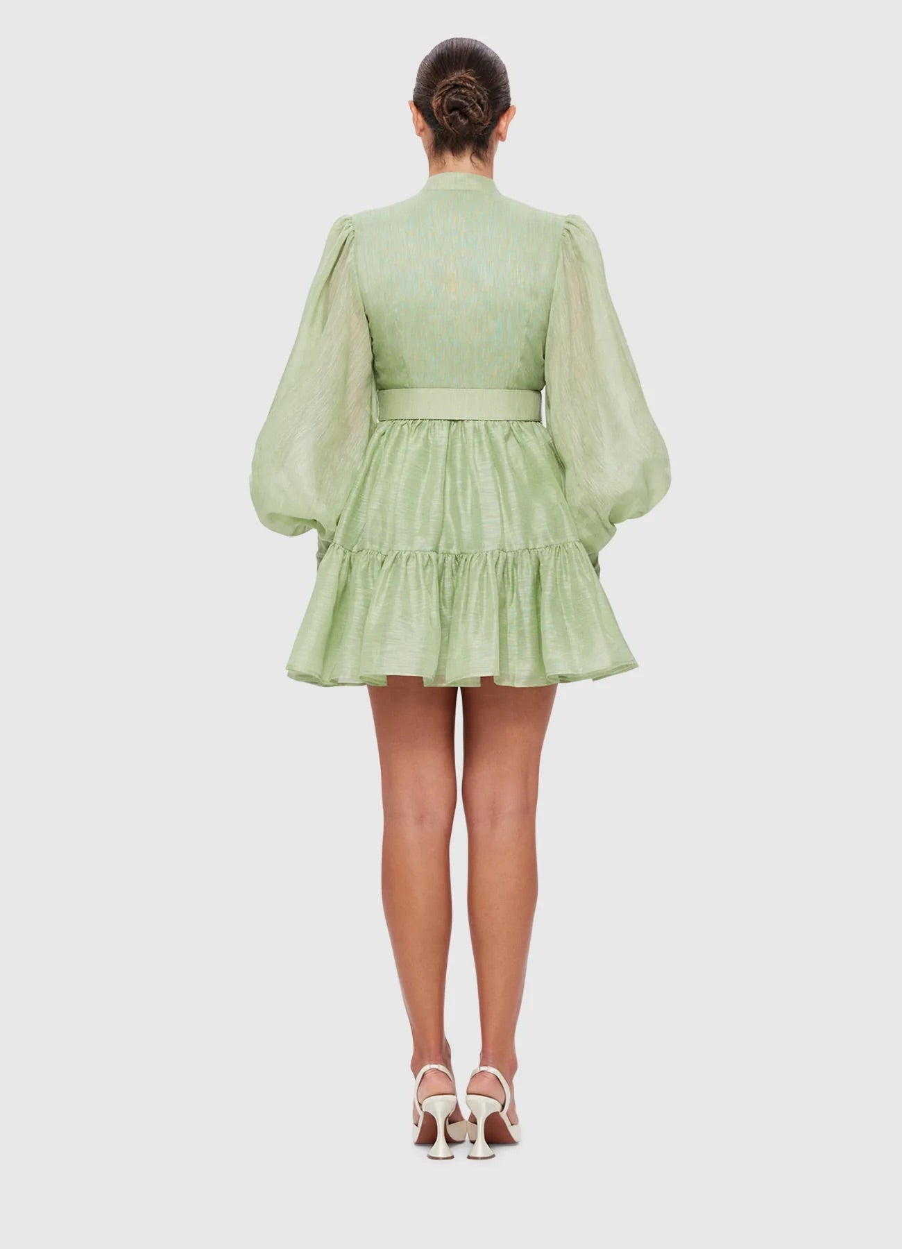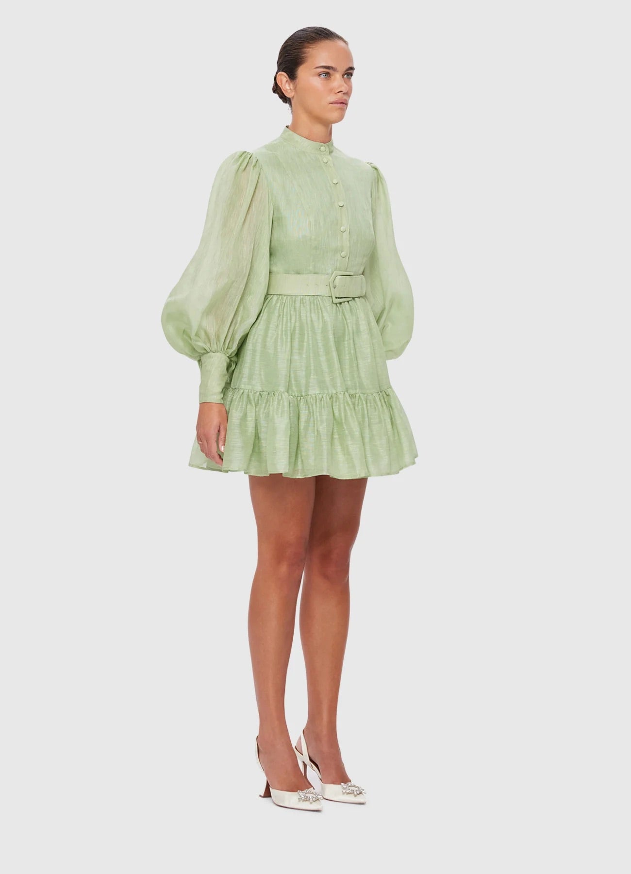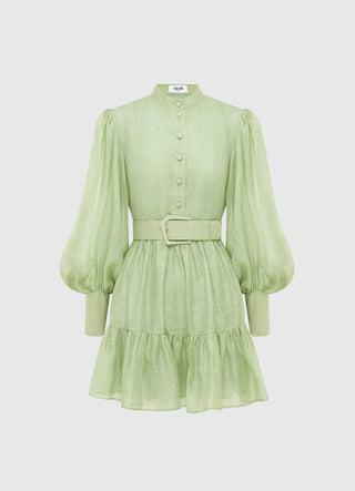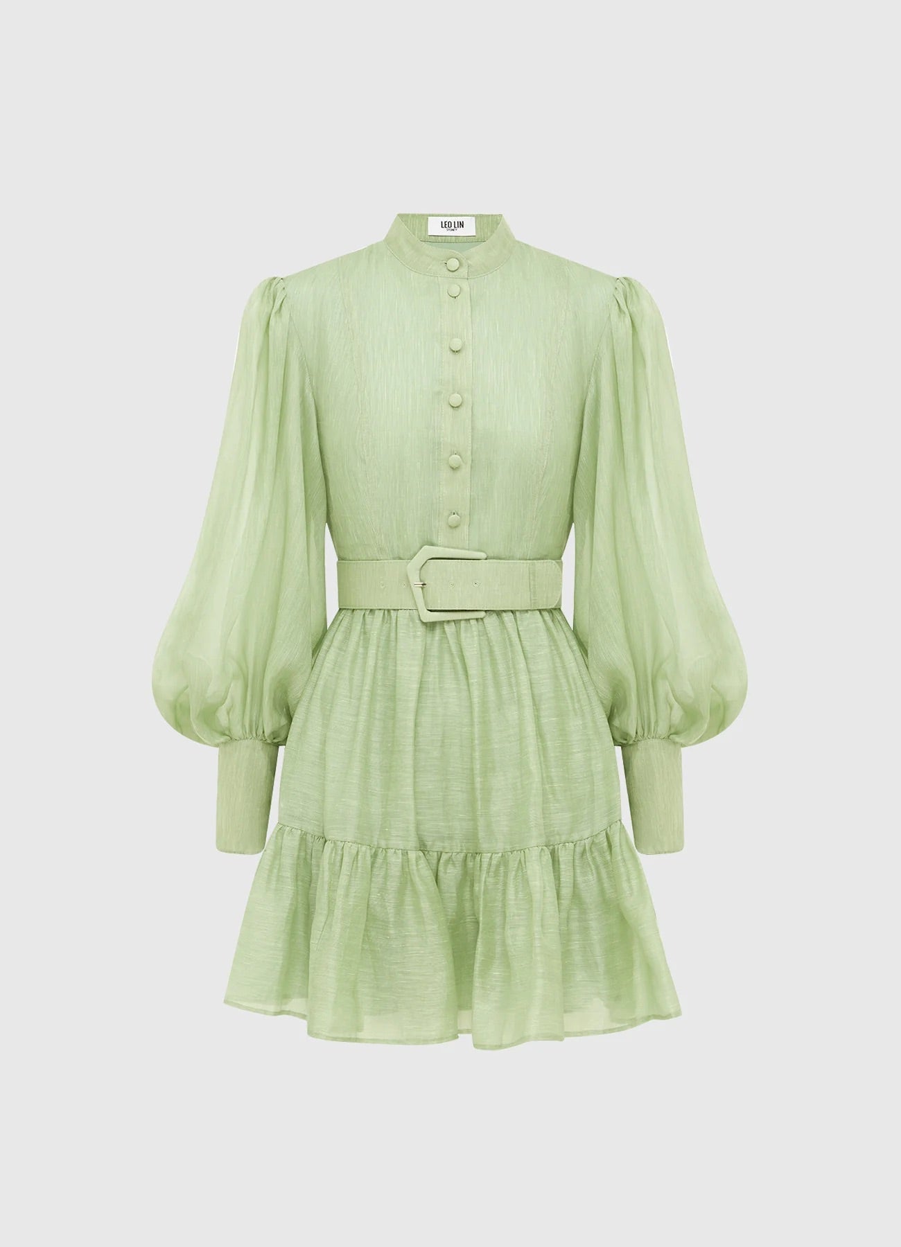 A perfect combination of contemporary style and classic charm, Leo Lin's Alexandra Belted Mini Dress in evergreen is carefully crafted from a luxurious silk linen blend. It boasts a mandarin collar, balloon sleeves with a button cuff and falls into a voluminous skirt with a ruffle hem. Its captivating green hue and flexibility to easily transition from day to night makes it a must-have item.