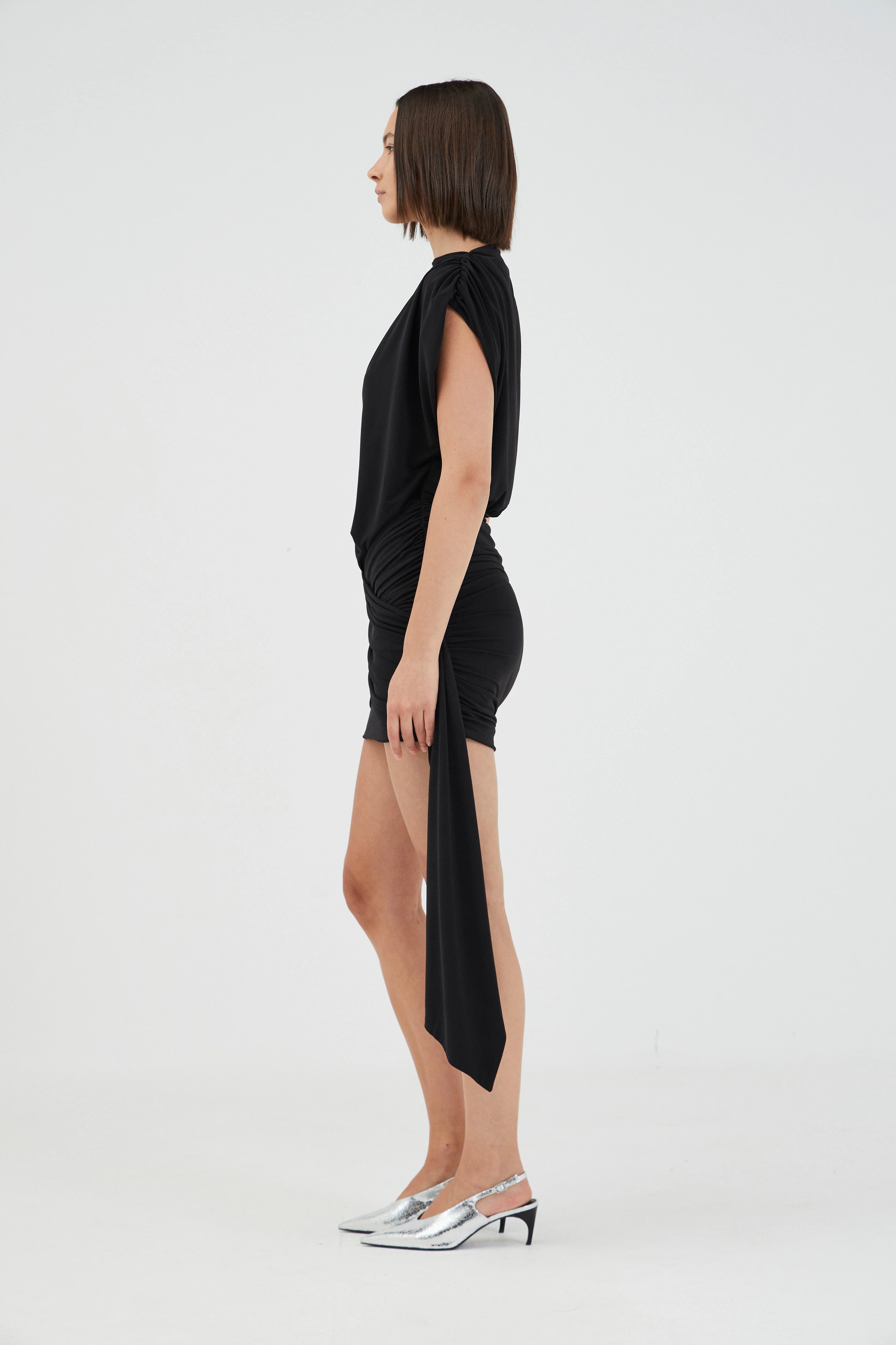 The Aura Draped Mini Dress offers a refined pairing of volume and structure. Featuring a relaxed drop-shoulder bodice, it falls into a gathered bandage-style skirt that fits close through the hip. A raised neckline and soft shoulder gathers add quiet dimension, while the asymmetric hem creates natural movement.