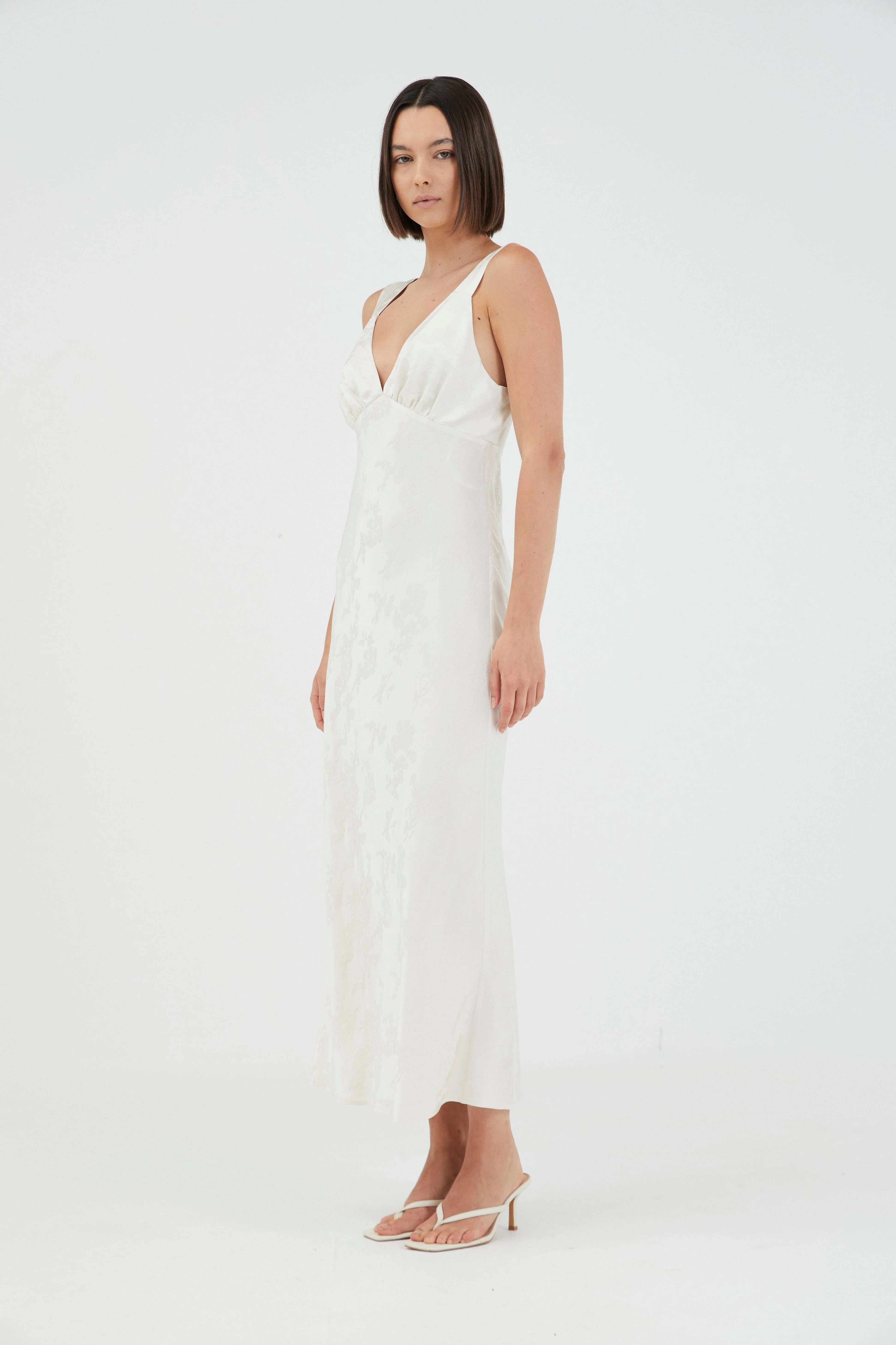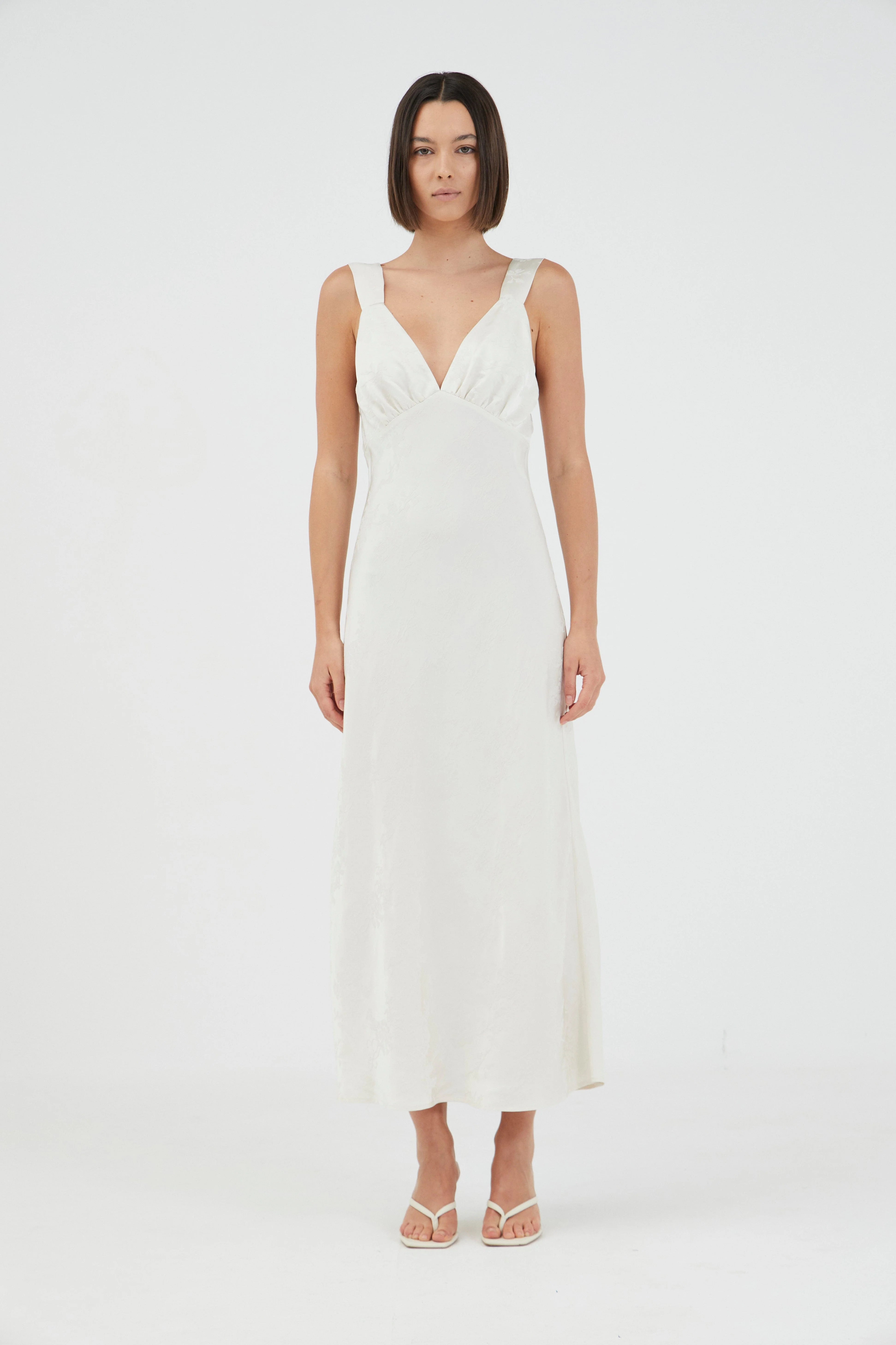 The Oasis Bias Slip Dress is designed to gently skim the body, it features soft V-neckline detailing with gathered bra-style panels, offering a subtle play on structure and softness. The bias-cut midi skirt falls with ease, creating a fluid silhouette that moves effortlessly. A delicate self-covered button and loop closure at the back neckline adds an elevated finish, while the fully lined bra provides gentle support.