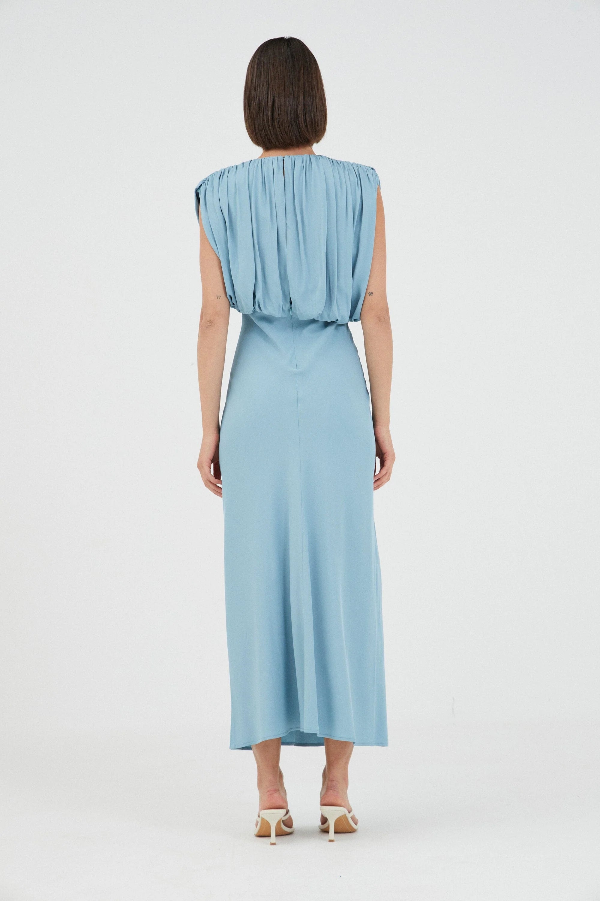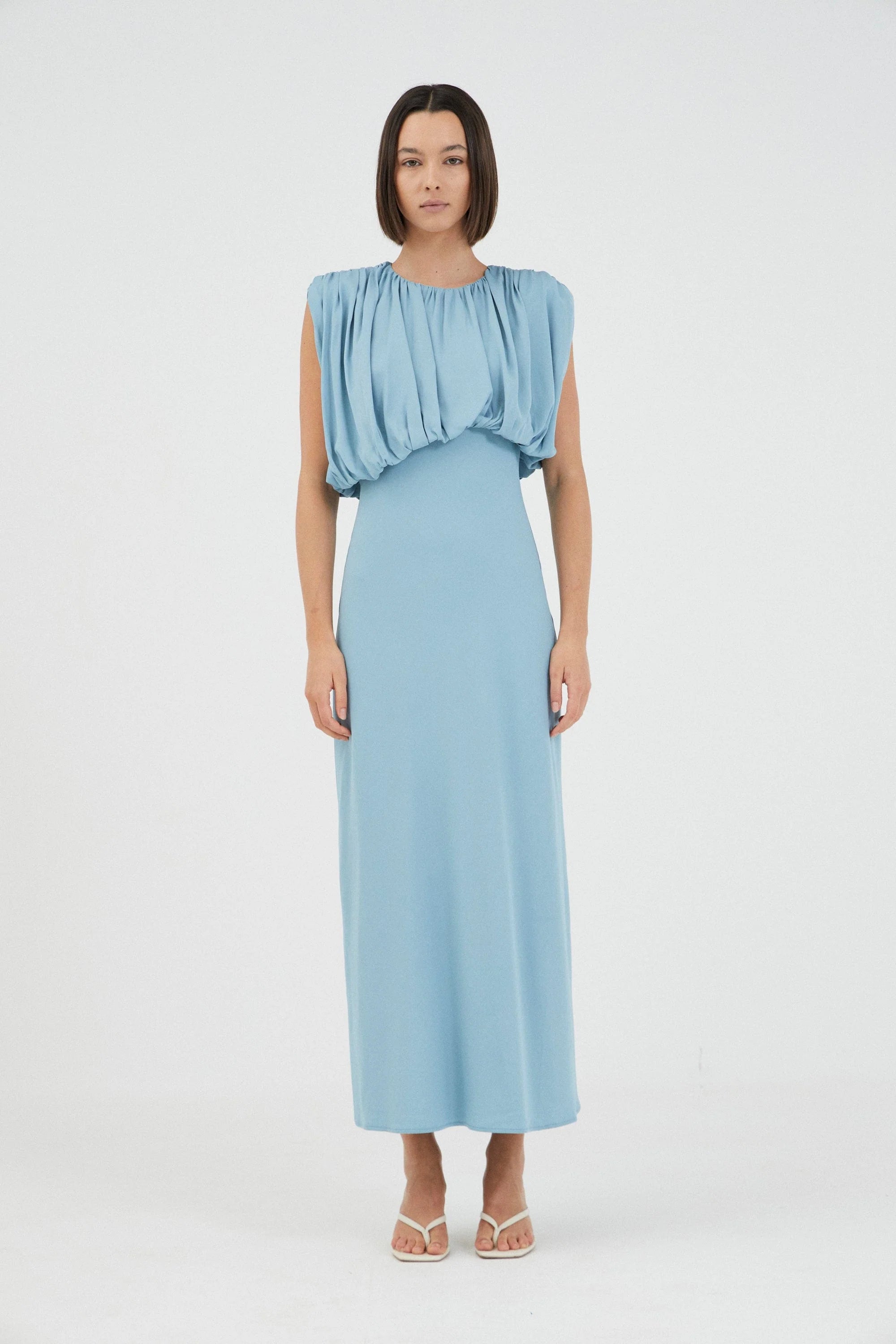 The Seraphic Midi Dress features a voluminous upper silhouette with gathered detailing at the neckline and shoulder seam. The balloon-hem bodice meets an asymmetric waist seam, with a bias-cut skirt that falls with ease. Wide shoulders create structure, while the gently contoured skirt offers contrast, balancing volume and drape for a refined finish.