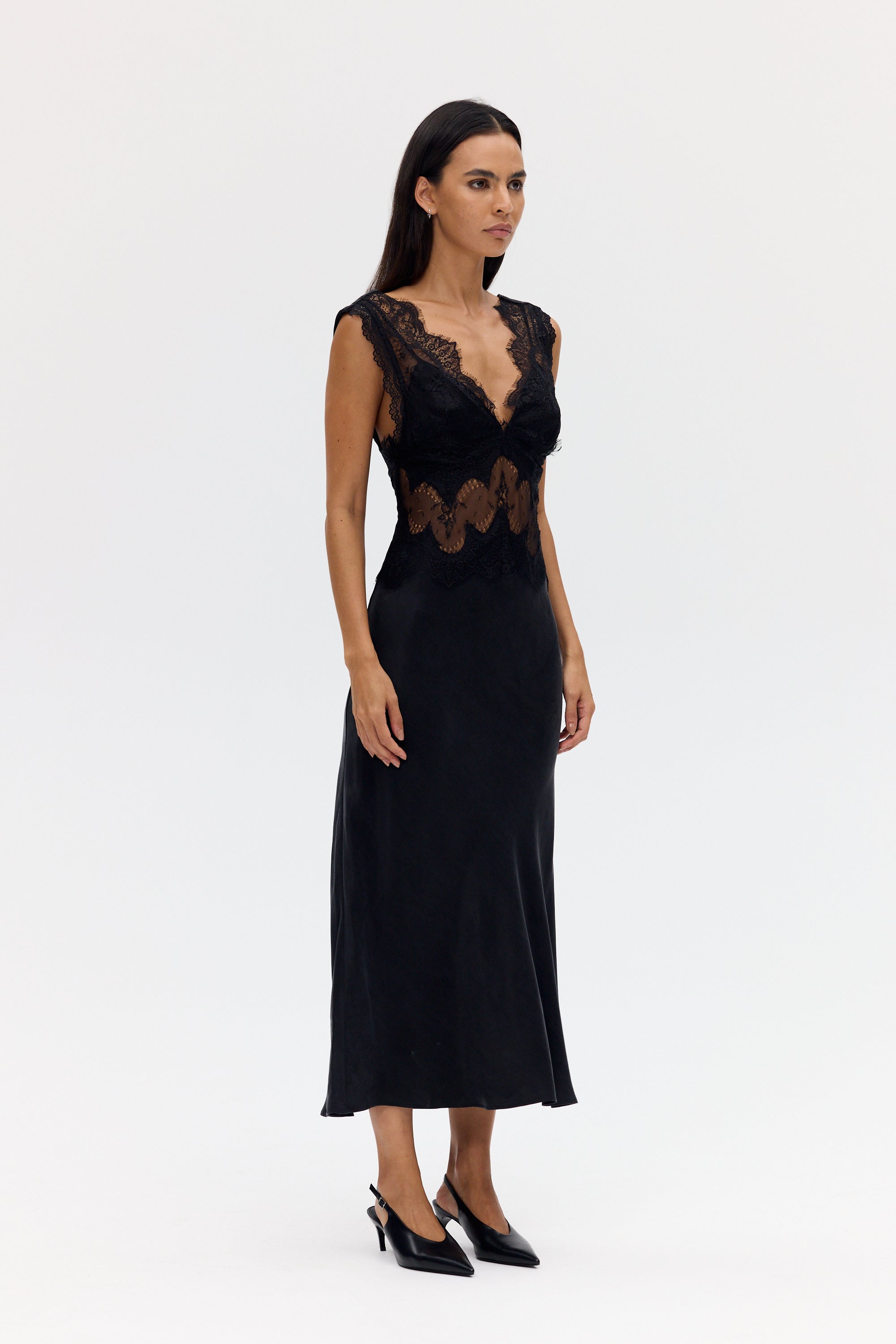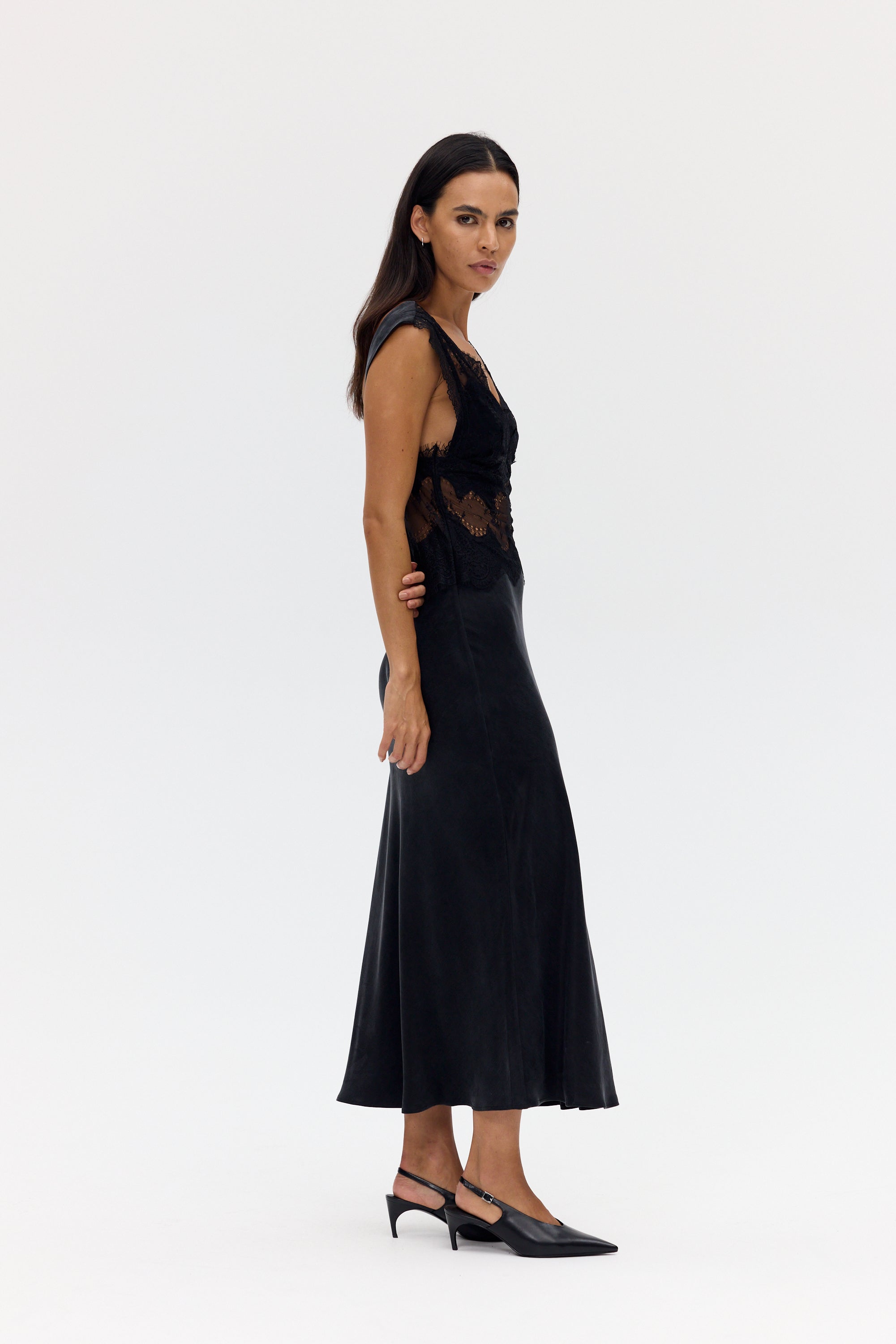 The Visions Lace Deep V Maxi Dress is crafted from a premium sandwashed Cupro, cut on the bias for a fluid drape and natural movement. Delicate lace traces the bodice, creating a striking interplay of sheerness and texture, while the silhouette falls effortlessly to skim the body.