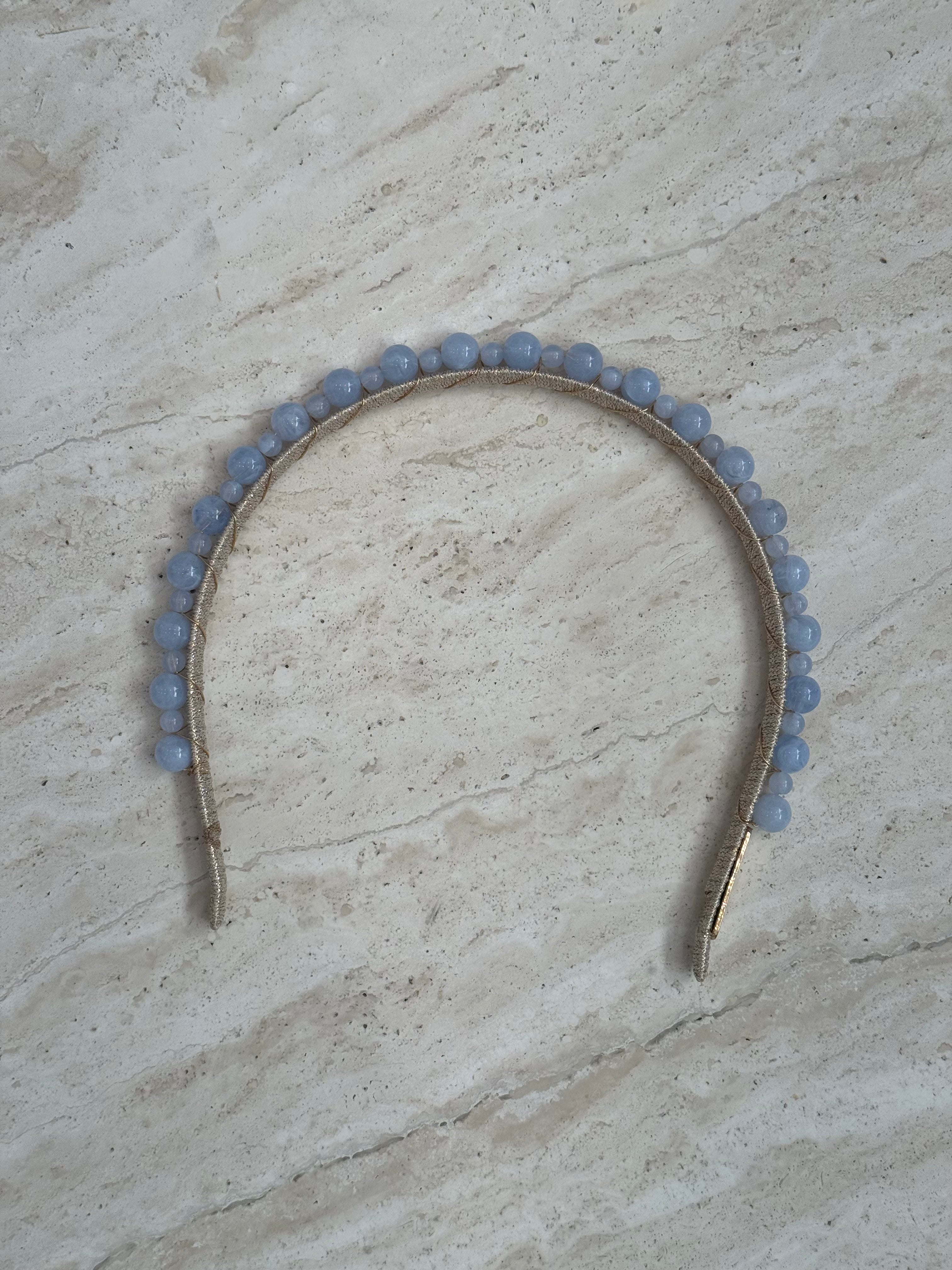 The Aria Headband in blue is a stylish and versatile headband. It features high-quality natural look glass beads on a lightweight golden headband. The ultimate piece for layering with other A'el Este designs or beautiful when worn on its own.