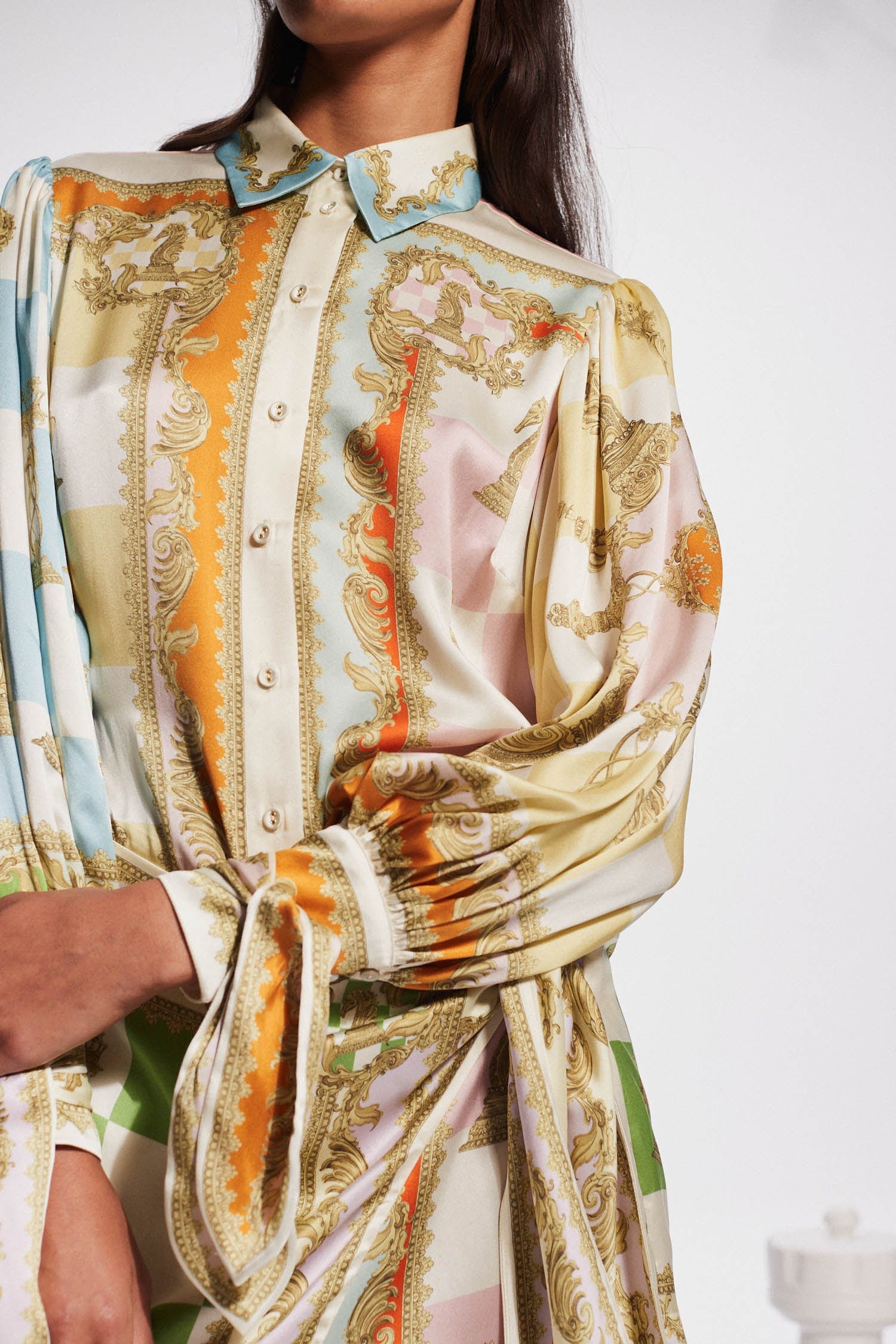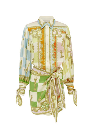 The Checkmate Silk Mini Dress by Alémais is a beautiful relaxed mini dress designed with a pointed collar, mini hem, balloon sleeves and finished with elasticated cuffed sleeves. Style the Checkmate Silk Mini Dress with a neutral coloured heeled sandal for a summer lunch event.
