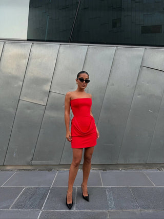 The Merci Mini Dress is the ultimate show-stopping dress in a vibrant cherry red. Its strapless design and ruched detailing at the front and back make for a flattering fit and eye-catching style. Be sure to turn heads at your next event with this hot mini dress