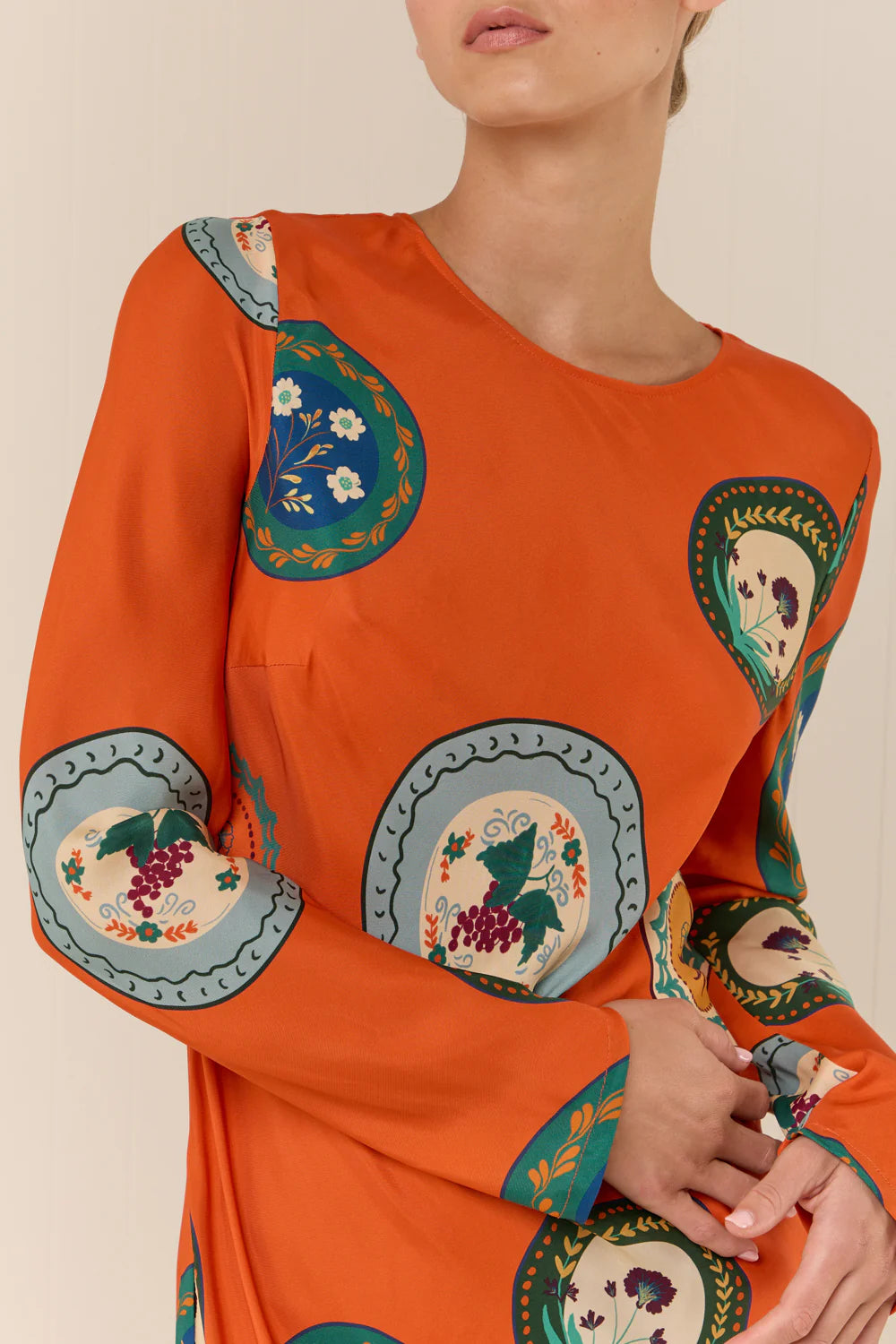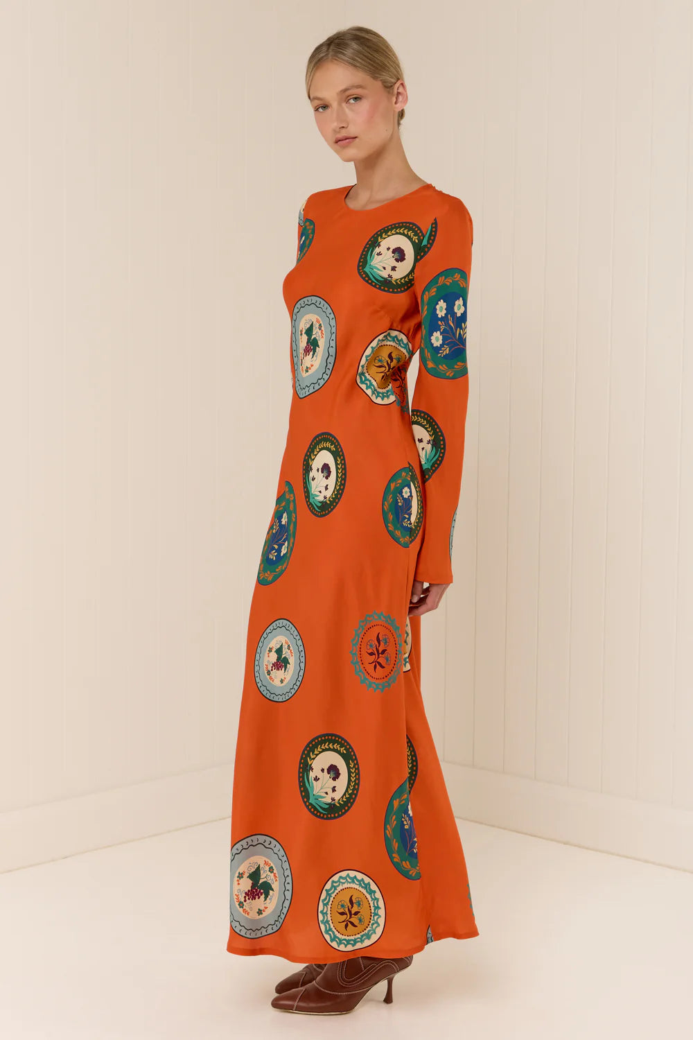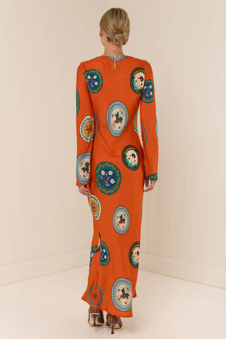 The Roma Dress showcases Palm Noosa's unique Orange Plates print and is made from a luxurious Lyocell blend. Tailored on the bias, it gently contours the body for an elegant silhouette. This dress features a rounded high neckline, flared sleeves, and an ankle-length hem, combining refined style with graceful movement.
